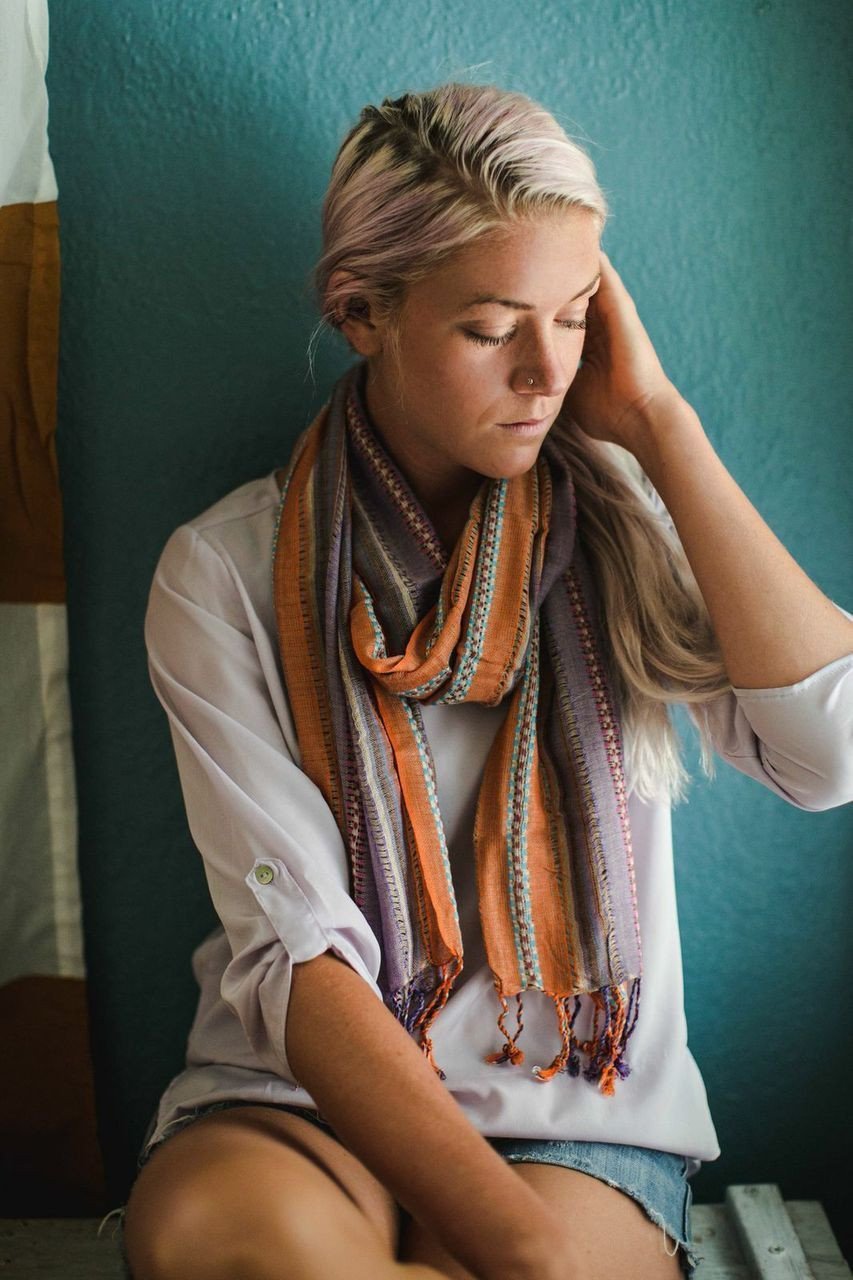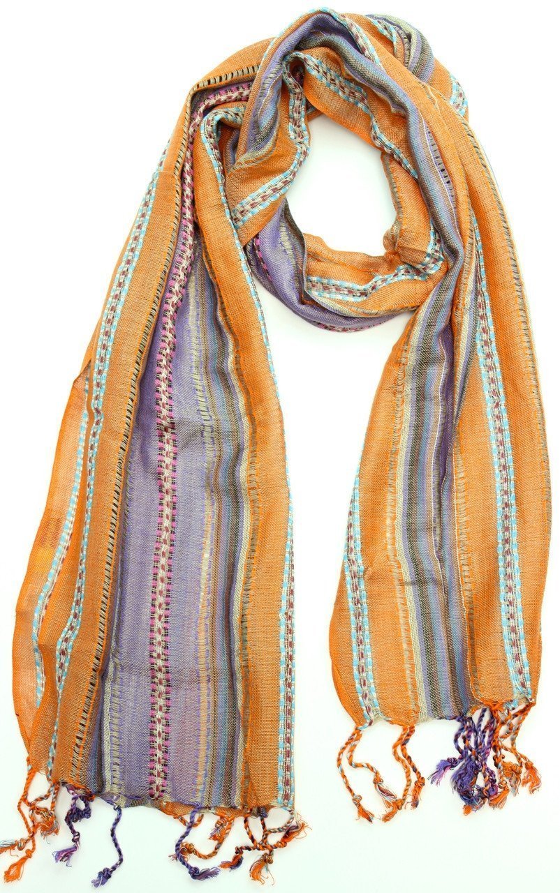 Orange and purple woven into this bold cotton scarf. Braided, colorful tassels hang at the ends.