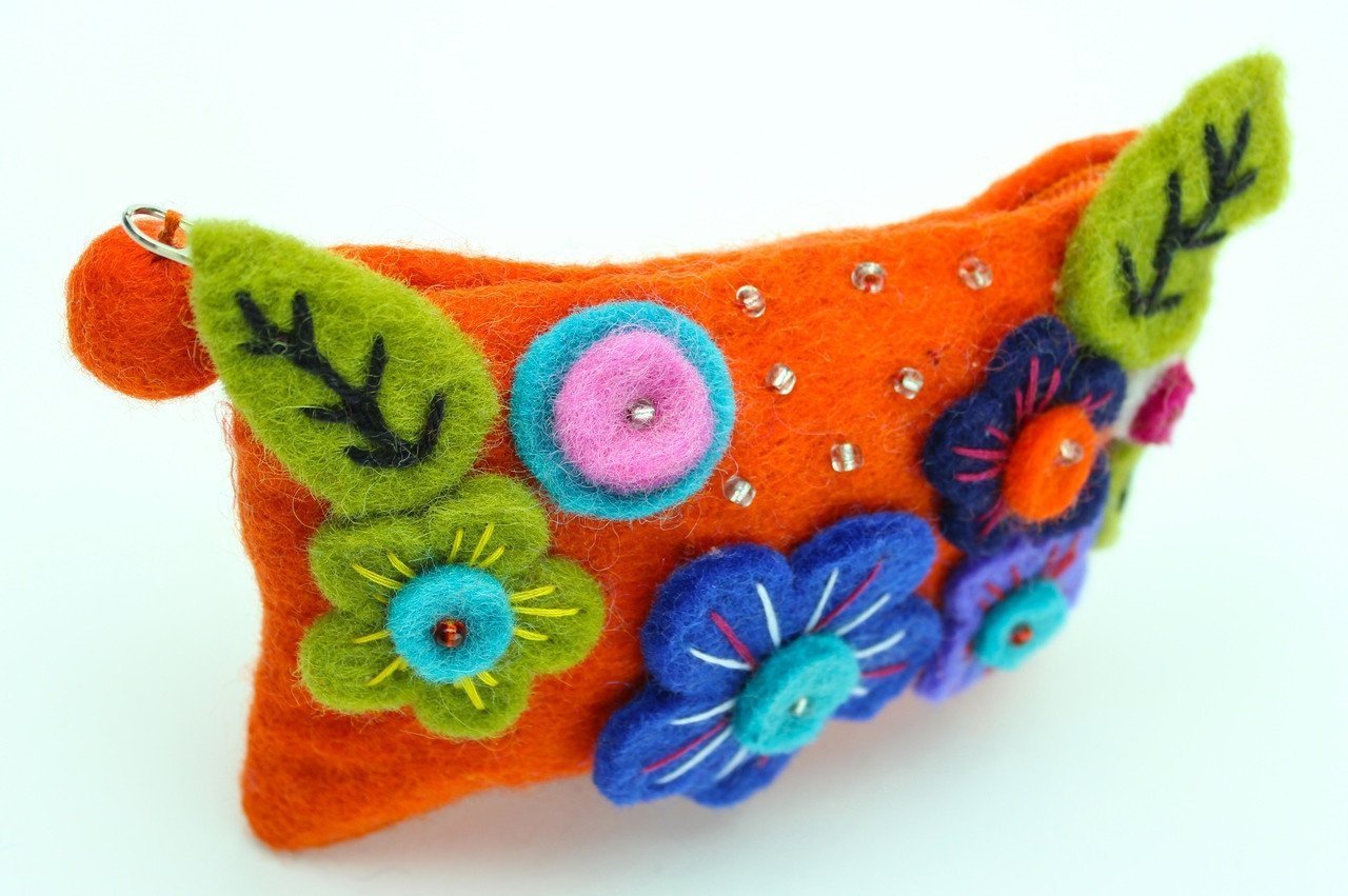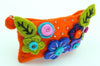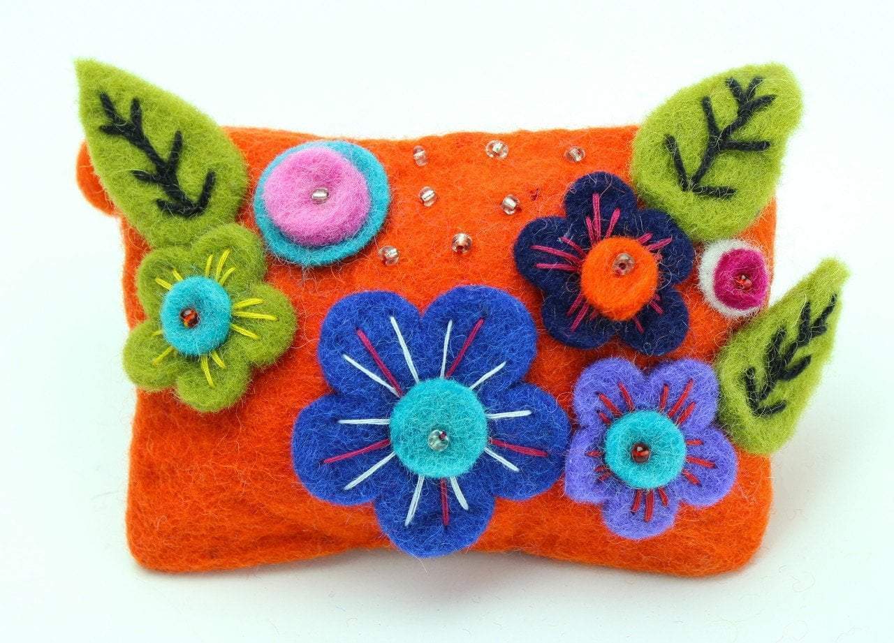 Cute orange felt coin purse adorned with felt flowers. Contains a zipper.