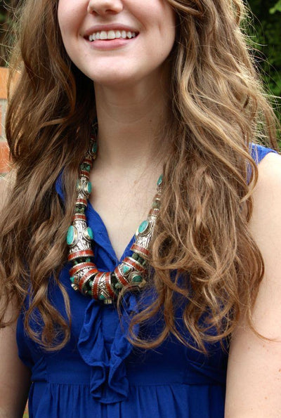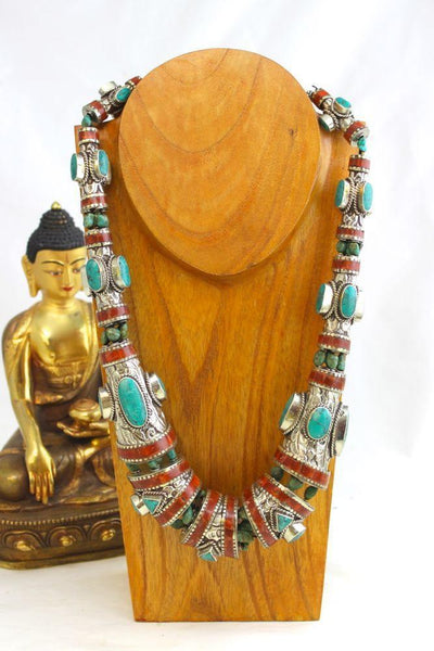 This one of a kind Tibetan necklace has a bold presence. It is truly a Tibetan item. Vintage coral and turquoise beads were used to construct this beautiful necklace.