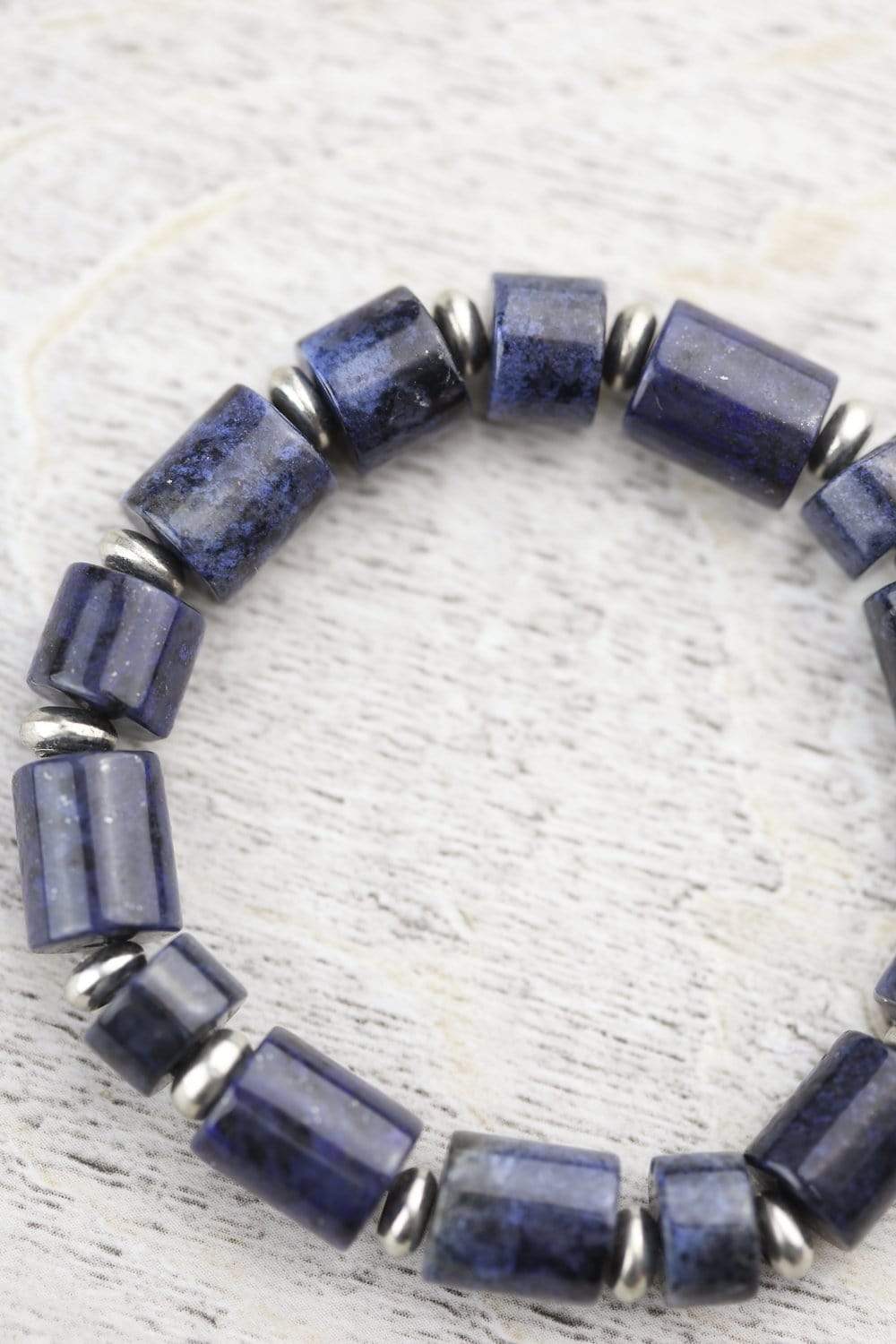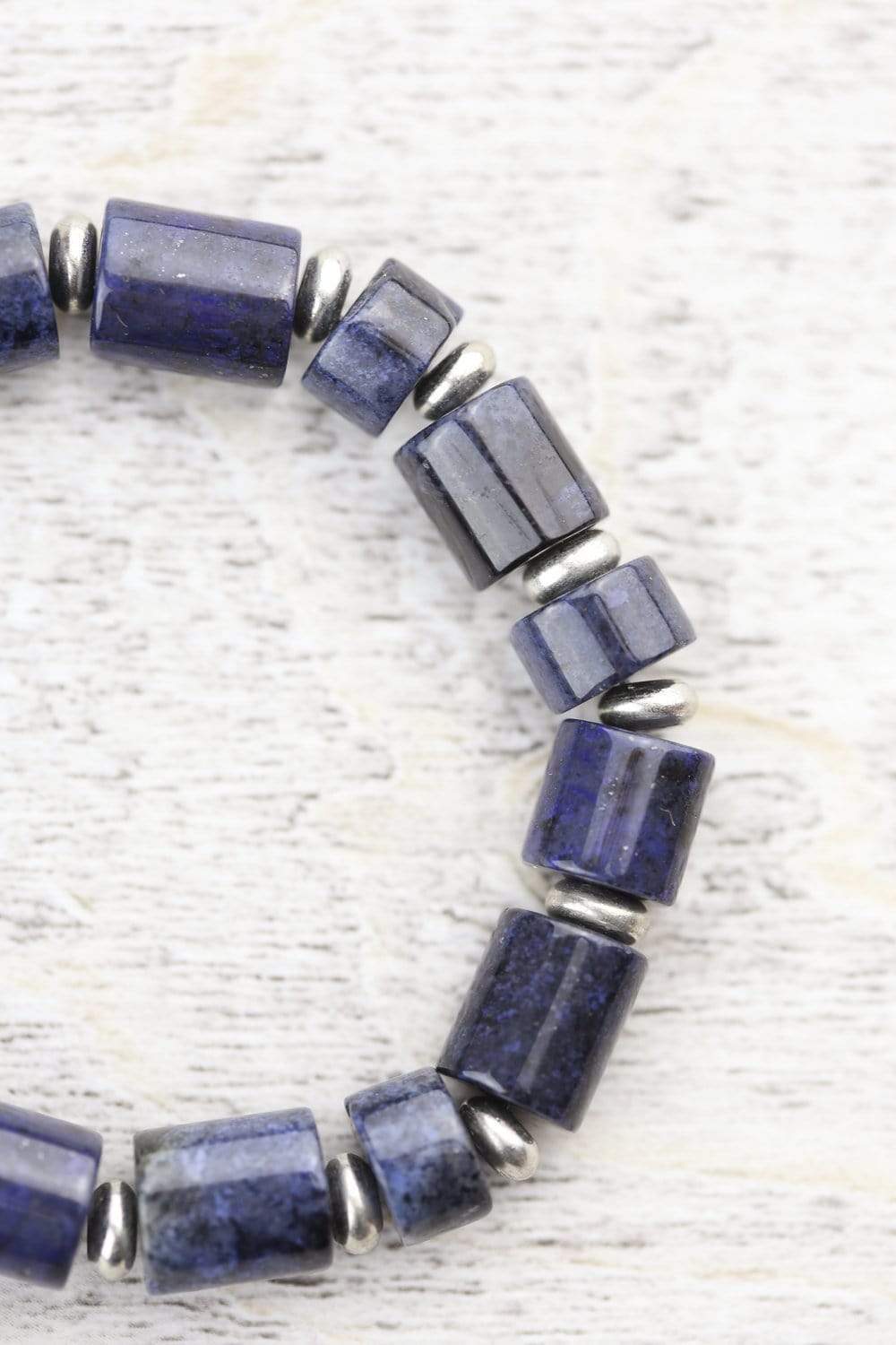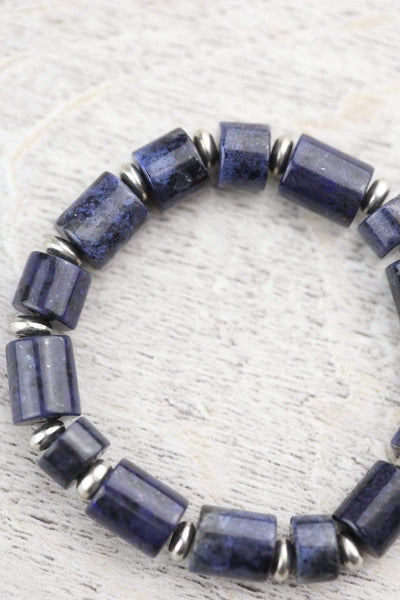 • This stylish and elegant bracelet features unique chunks of dumortierite gemstones separated by silver plated spacers on stretchy cord.