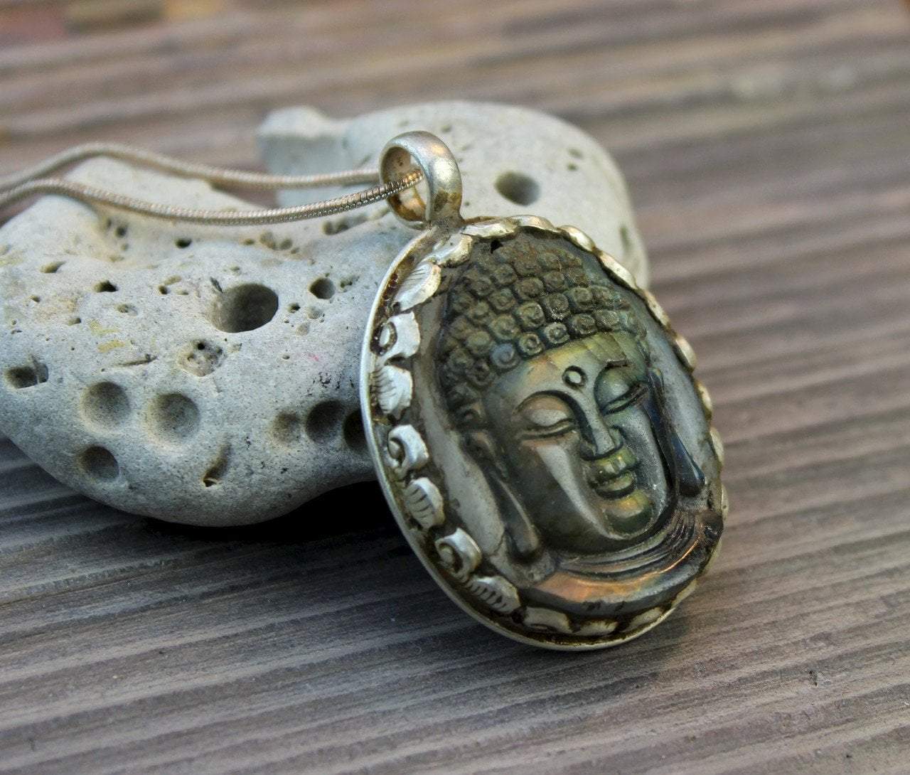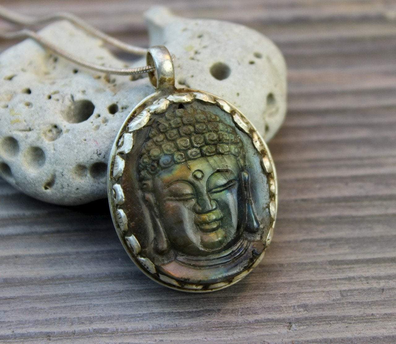 Hand carved labradorite pendant set in sterling silver rope setting. Handmade in Nepal with love and care.