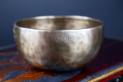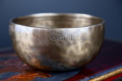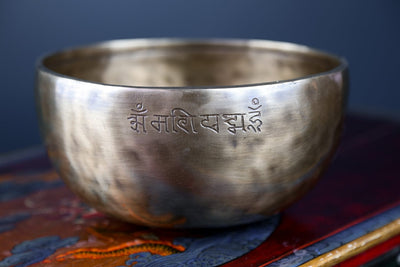Each bowl features gorgeous hand carved details including an exclusive Full Moon Singing Bowl stamp, an original makers mark, and the mantra of compassion in Tibetan script.