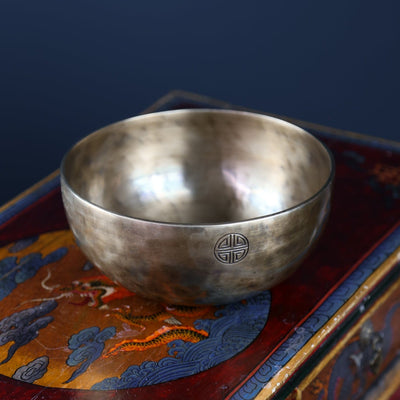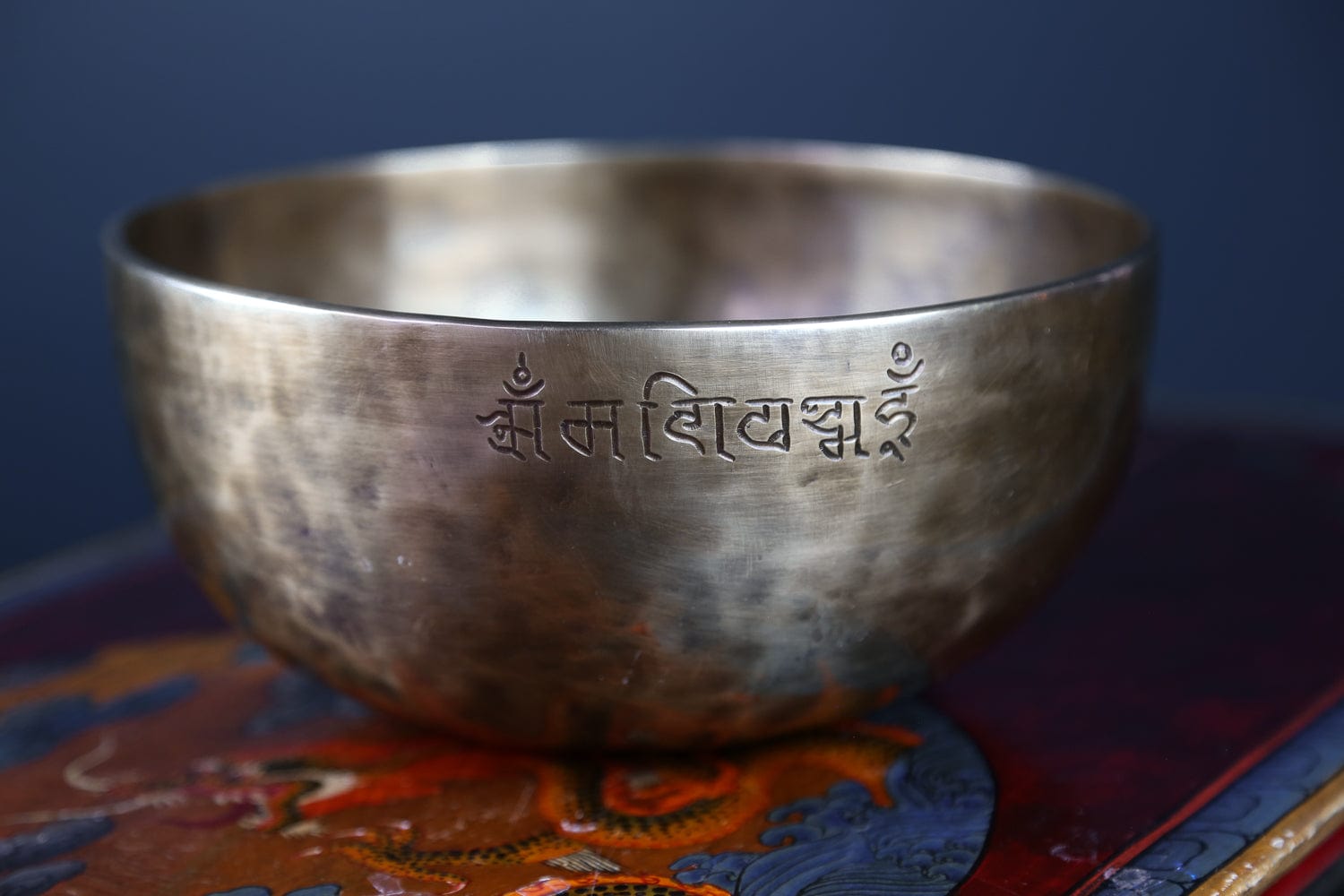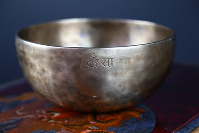 Each bowl features gorgeous hand carved details including an exclusive Full Moon Singing Bowl stamp, an original makers mark, and the mantra of compassion in Tibetan script.