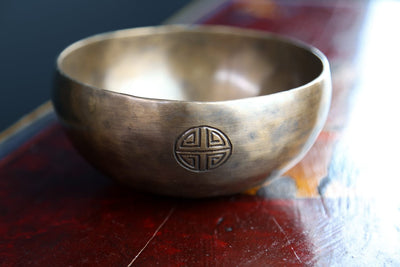 Each bowl features gorgeous hand carved details including an exclusive Full Moon Singing Bowl stamp and the mantra of compassion in Tibetan script.