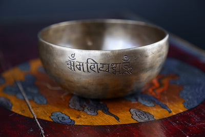 Each bowl features gorgeous hand carved details including an exclusive Full Moon Singing Bowl stamp and the mantra of compassion in Tibetan script.