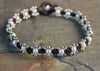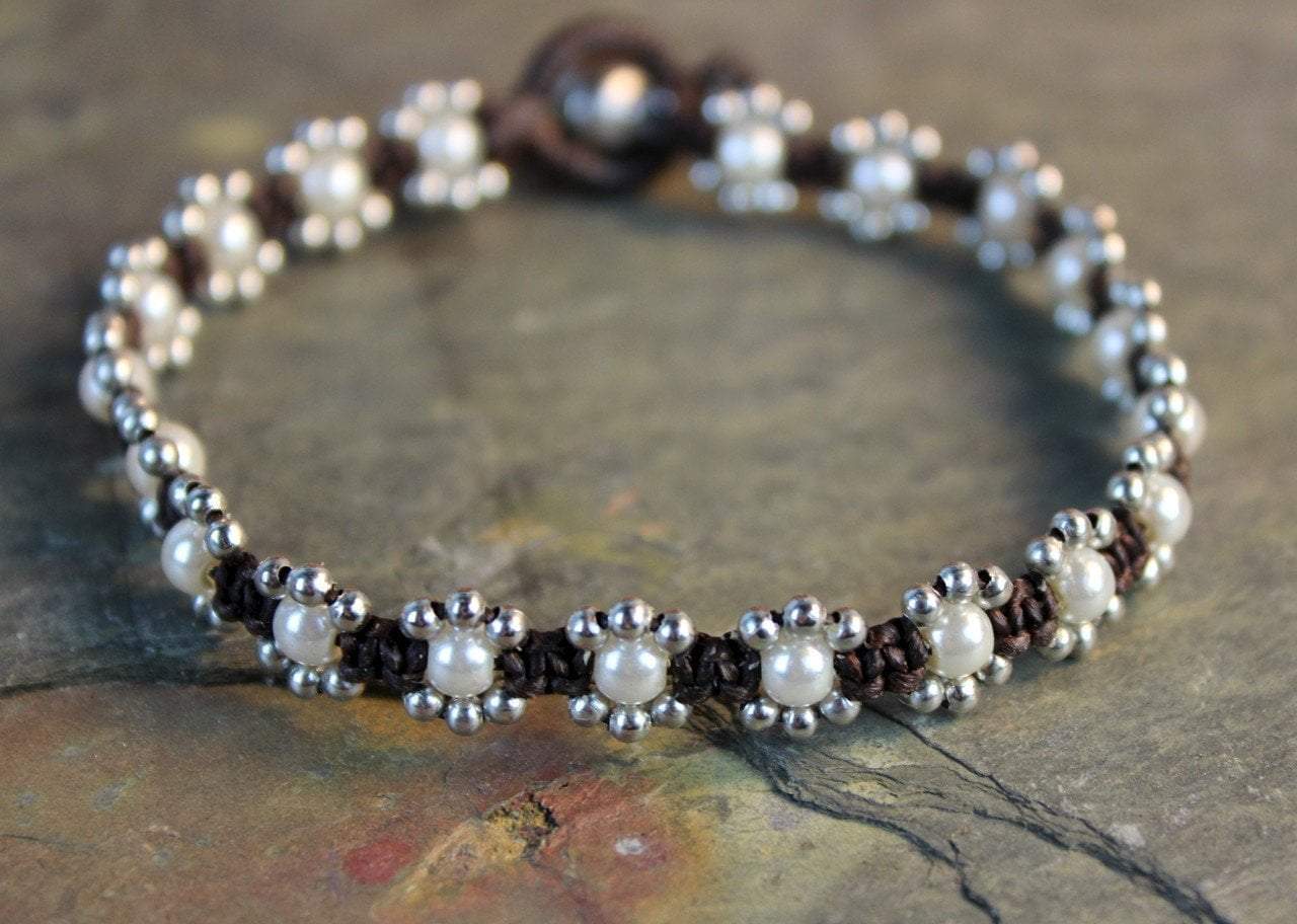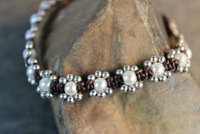 Mother of pearl and silver beads hand woven on darl brown wax cord. Silver bell at the end for button closure.