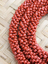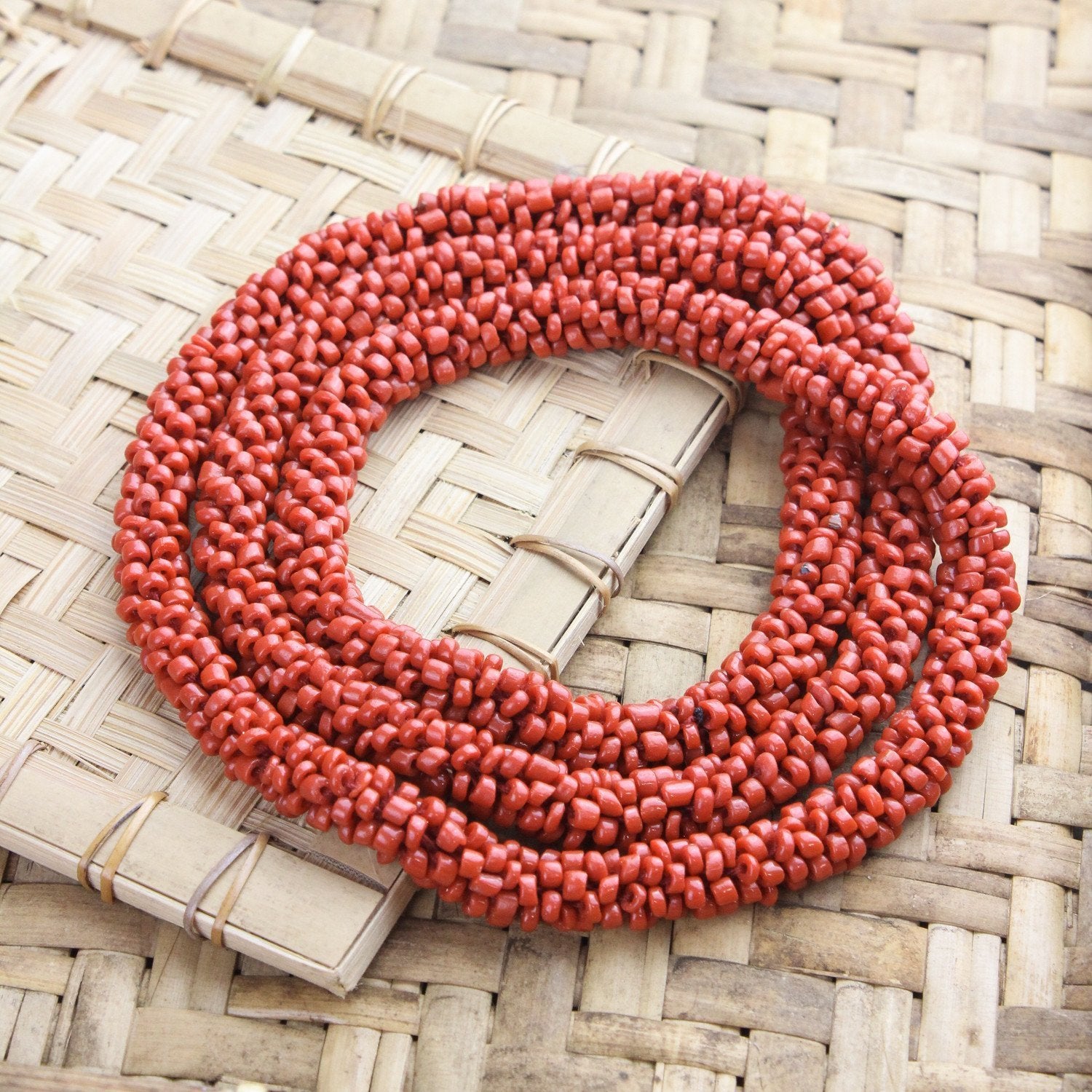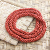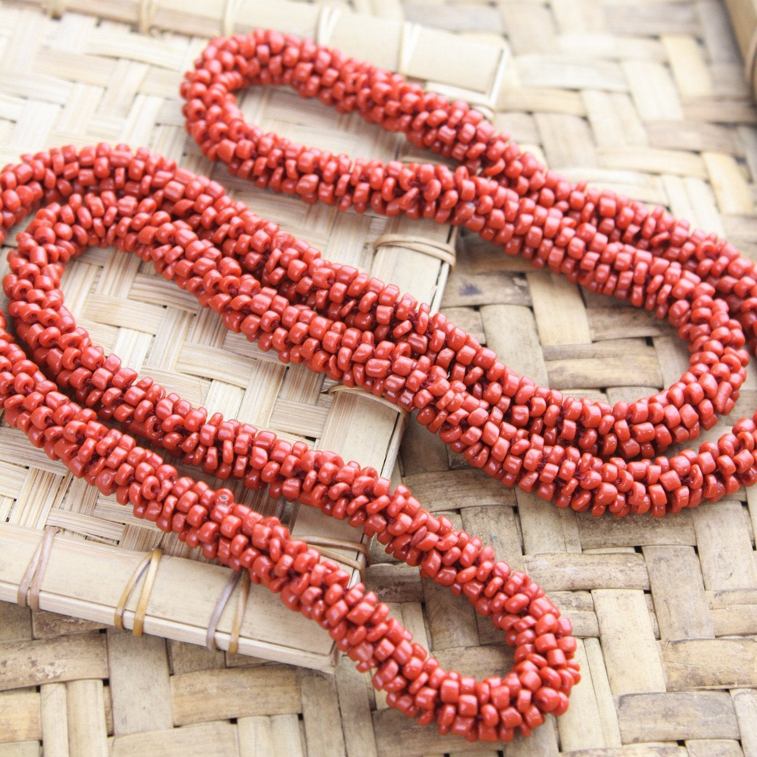 This beautiful hand beaded necklace can also be worn as a wrap bracelet. Various sizes of small red coral colored beads are hand strung to create this thick, single strand, braided necklace.