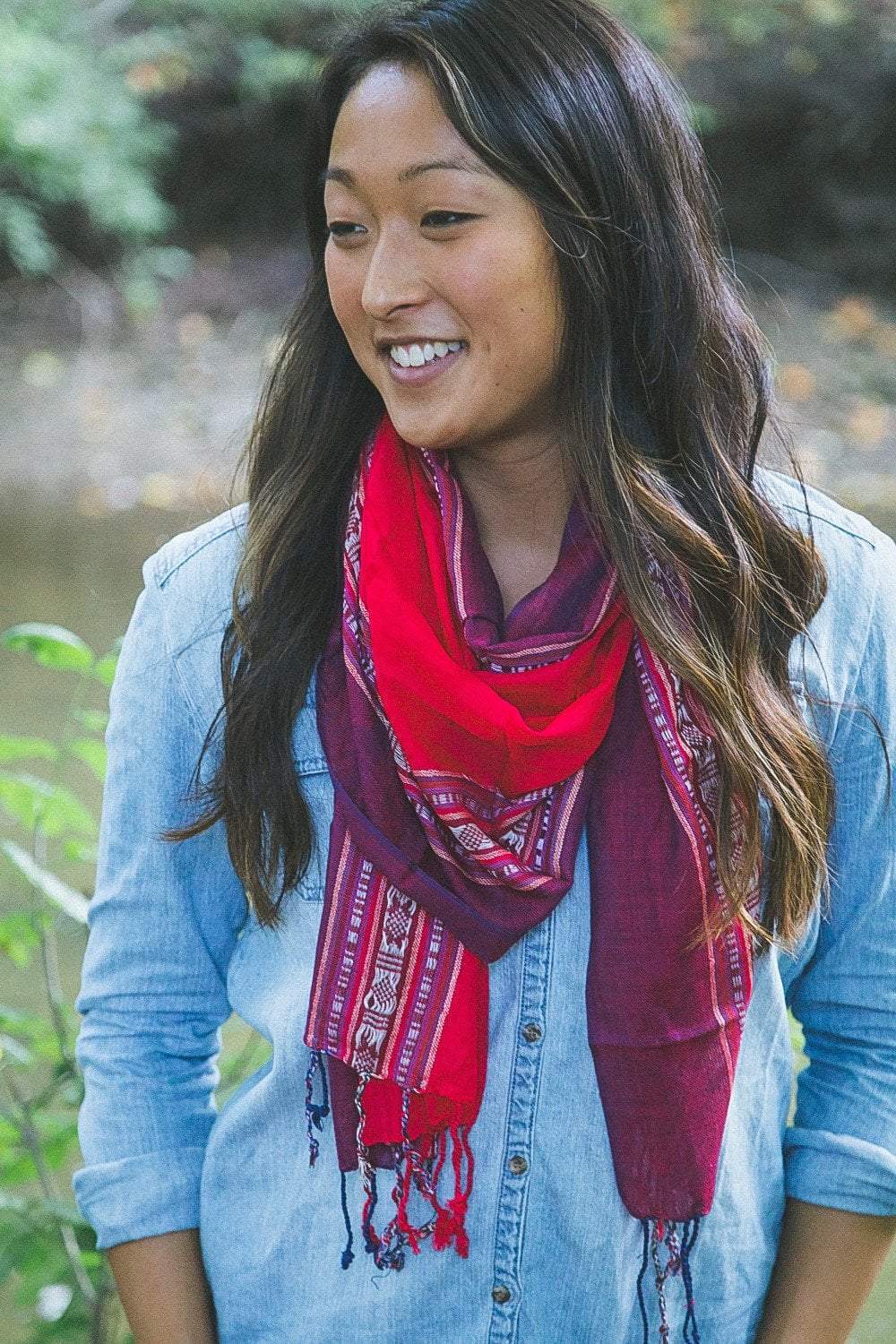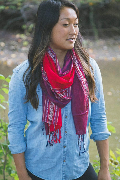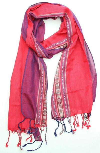 Scarf features gorgeous colors along with a vintage pattern.  Includes beautifully braided, colorful tassels.  Made of handwoven cotton.