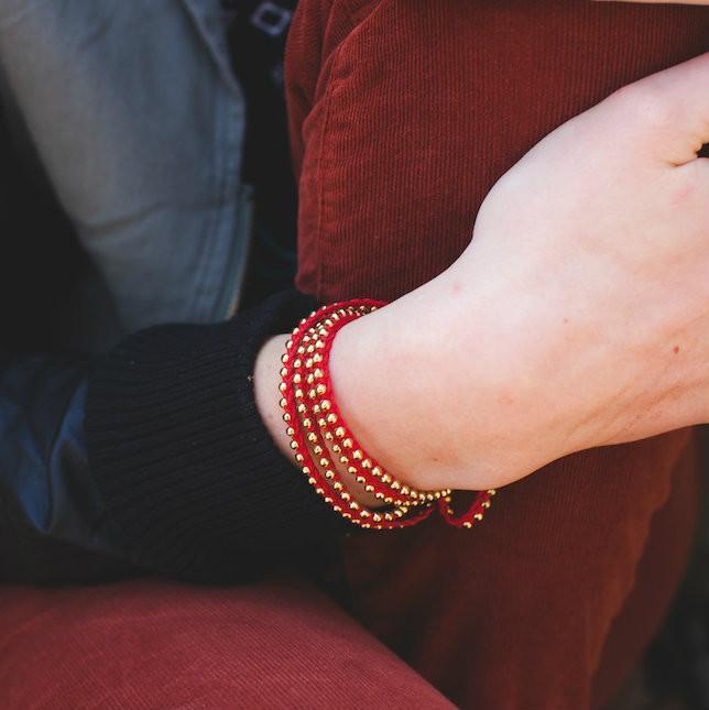 Cotton woven cord interwoven with brass beads.