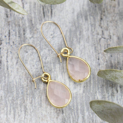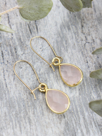 These adorable faceted rose quartz earrings are the perfect addition to any outfit. The dainty pear shaped gemstone is wrapped in a gold-plated setting and hangs from gold filled wires. Designed to match with our beautiful Rose Quartz and Om Kindness Necklace!
