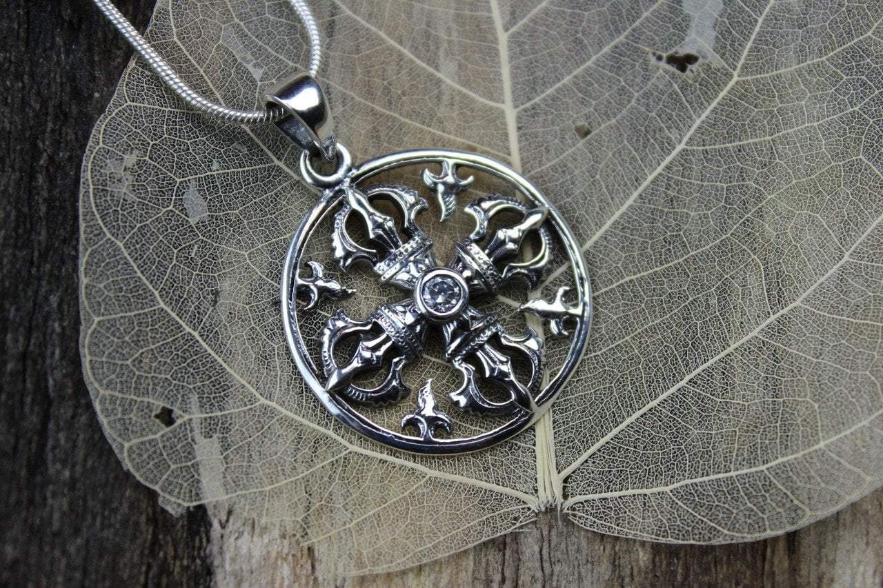 Sterling Silver Dorje Pendant with cubic zirconia stone in the middle