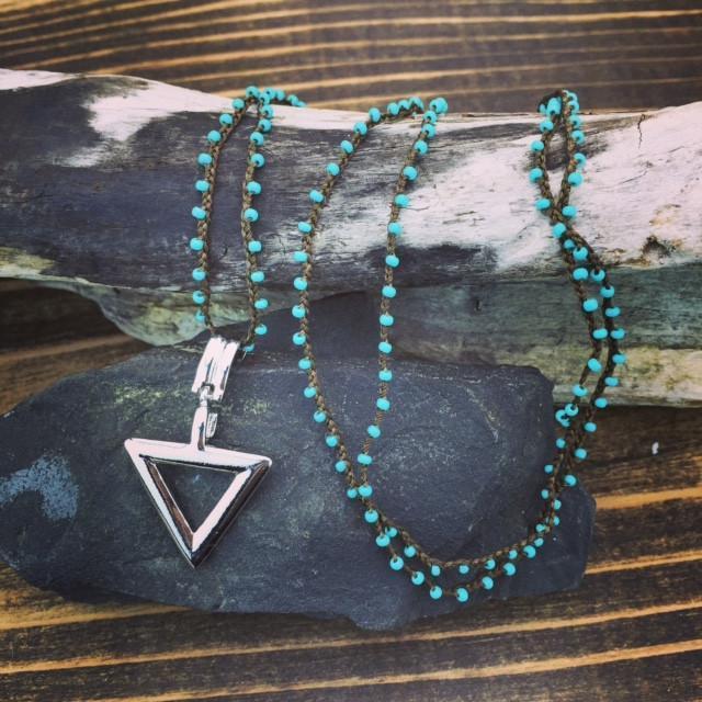 This simple triangle pendant makes this necklace truly unique.  The triangle pendant is strung on a hand woven turquoise chain from Nepal.