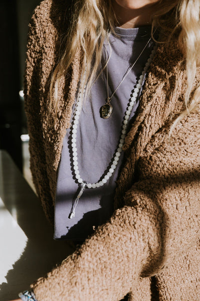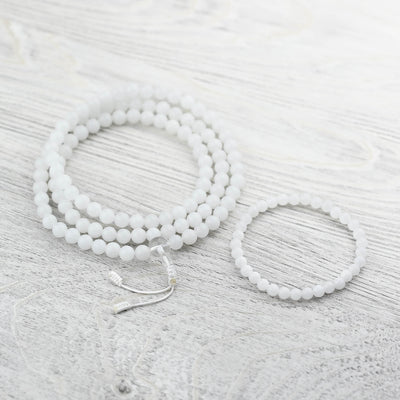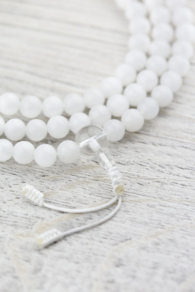 • Hand strung by artisans in Kathmandu, this mala necklace and bracelet features beautiful selenite beads from Morocco finished with a gorgeous quartz guru bead.