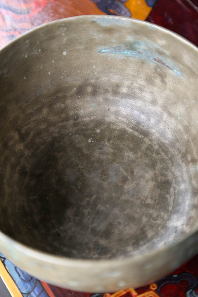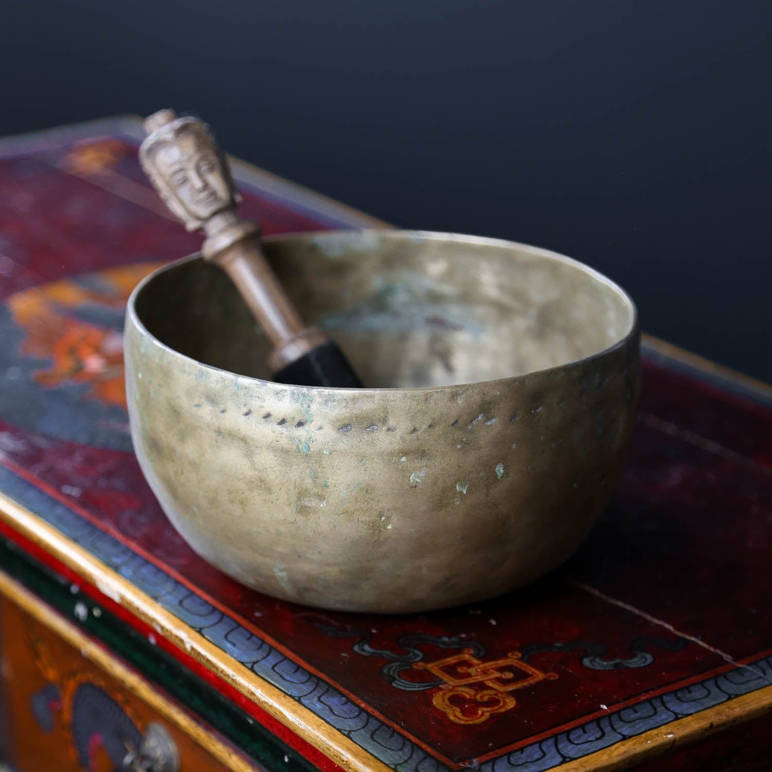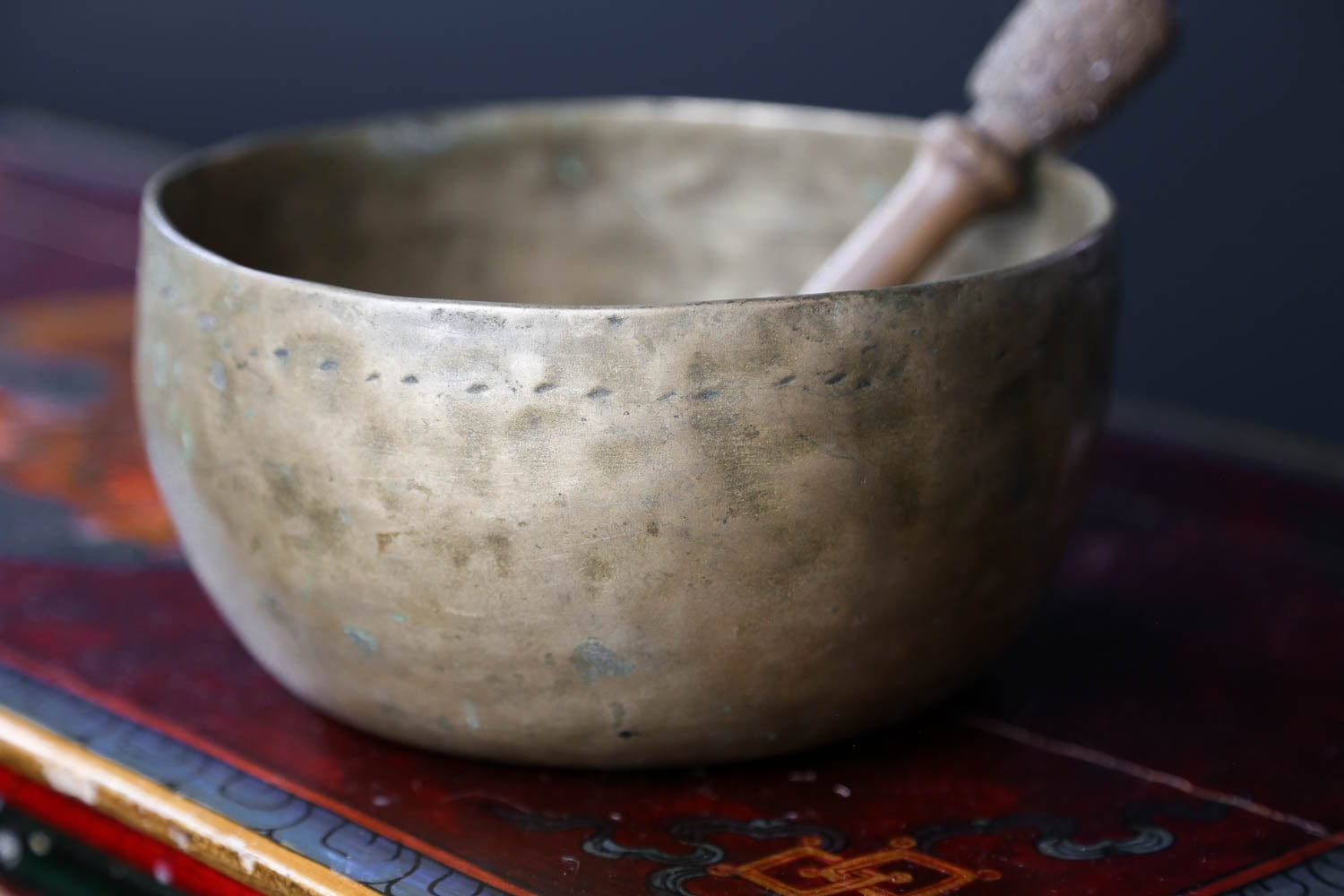 Each time we're able to get a small collection of these bowls is exciting as they are exceptional. Antique Tibetan singing bowls like this one are highly sought after for their remarkable quality sound, rich tones, and unique physical characteristics. Every handmade mark tells a story of the bowls history!