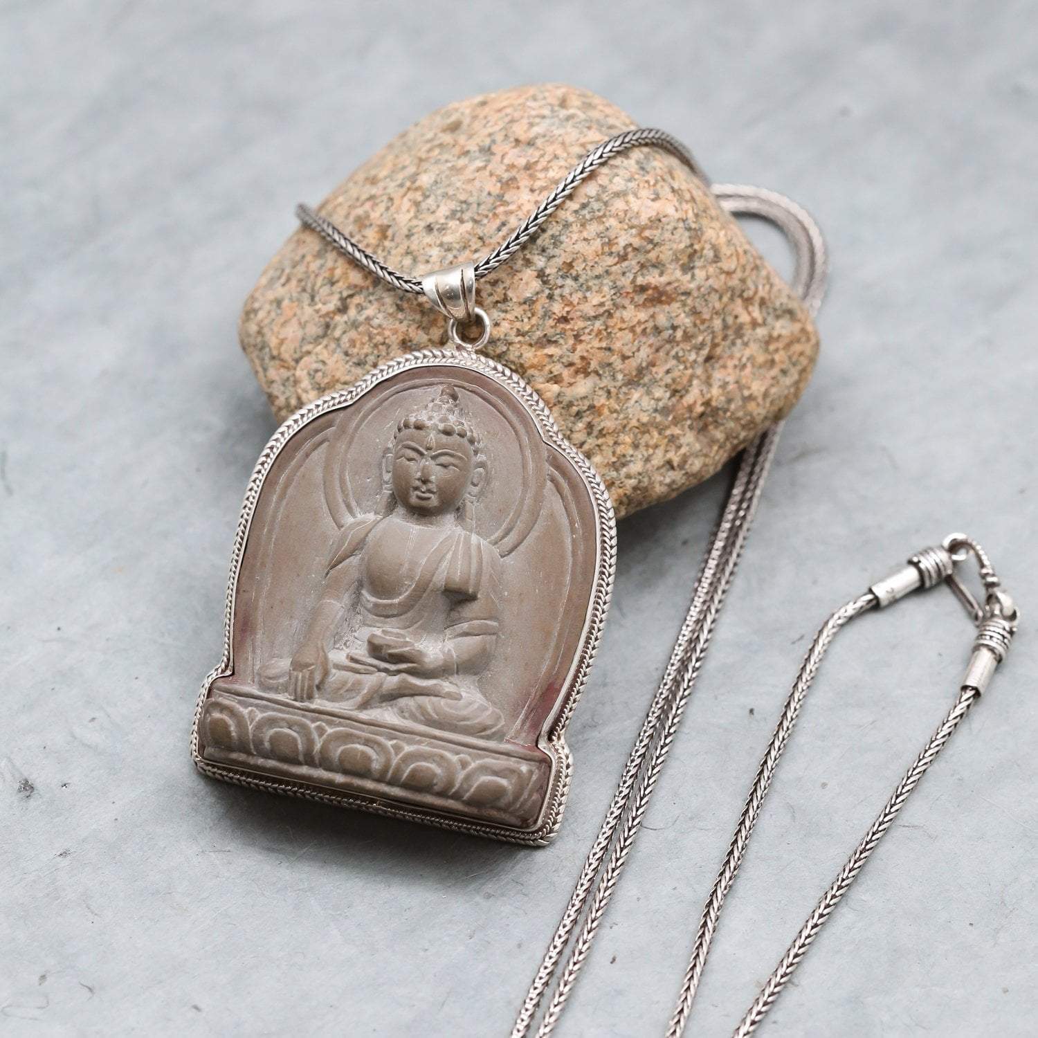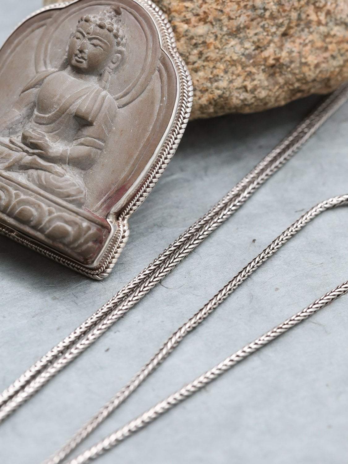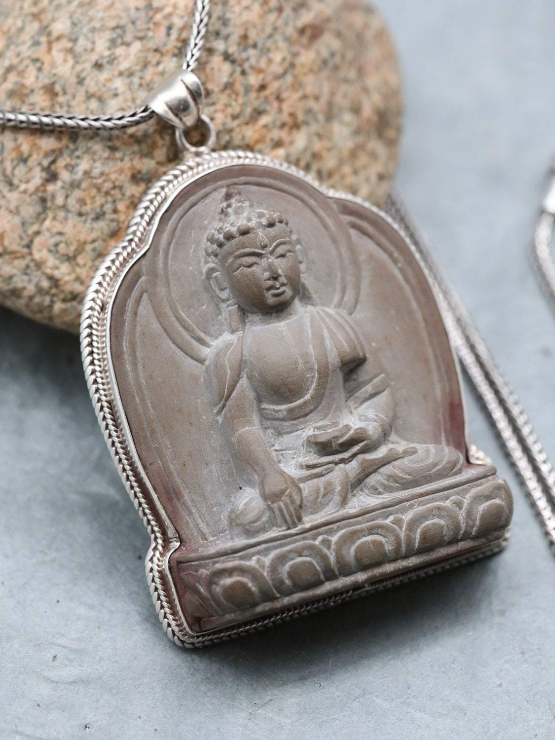 This one-of-a-kind necklace includes a hand carved stone pendant in a sterling silver setting that is strung on a long sterling silver woven chain. It is truly a work of art! Pendant is handmade in Nepal and features an image of Shakyamuni.