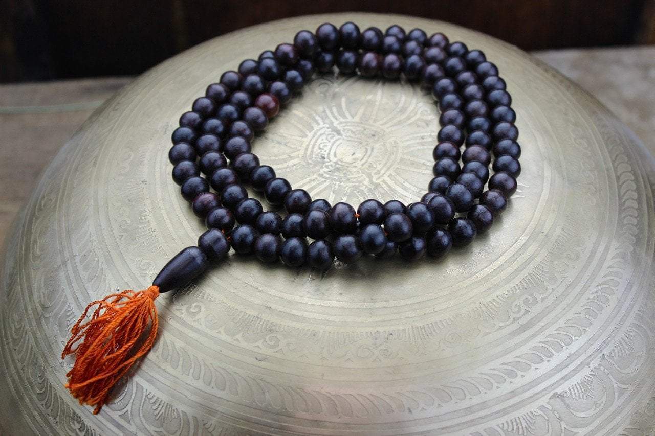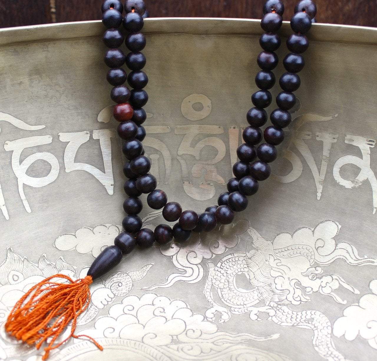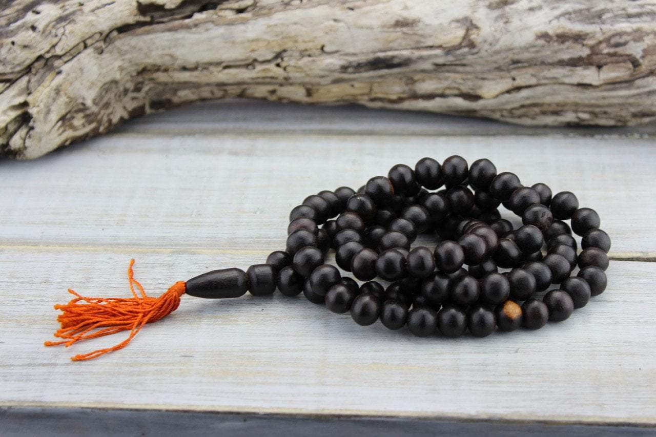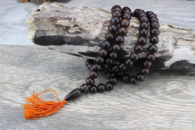 Unique Sheesham wood, also known as Indian Rosewood, bead mala features an orange tassel.