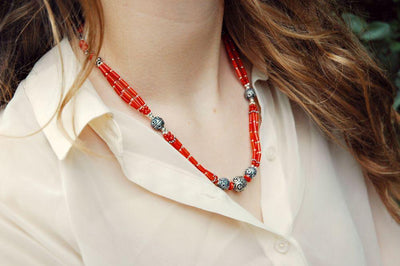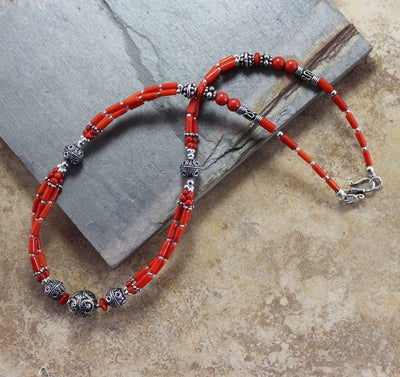 While Tibetan jewelry is often heavy and bold... this necklace is traditional, but simple, delicate, and elegant. All of the coral beads are 'sherpa coral' or colored glass and white heart coral. None of the coral is endangered or live coral. Silver spacers and silver plated beads give this necklace an elegant look that can be dressed up or down.