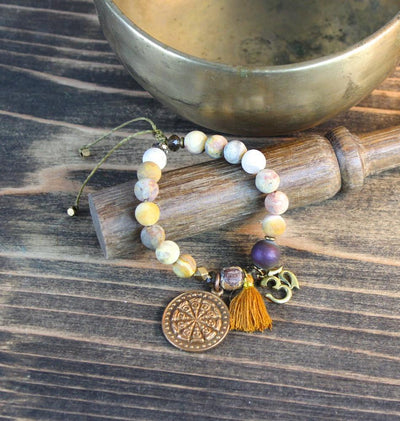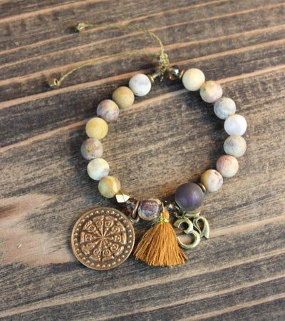 Tan jasper matte beads with copper om pendant, purple druzy bead, gold tassel, gold leaf Buddha bead, large bronze Thai Buddha Amulet, smoky quartz accent beads and copper accent beads. Pull cord to tighten around your wrist.
