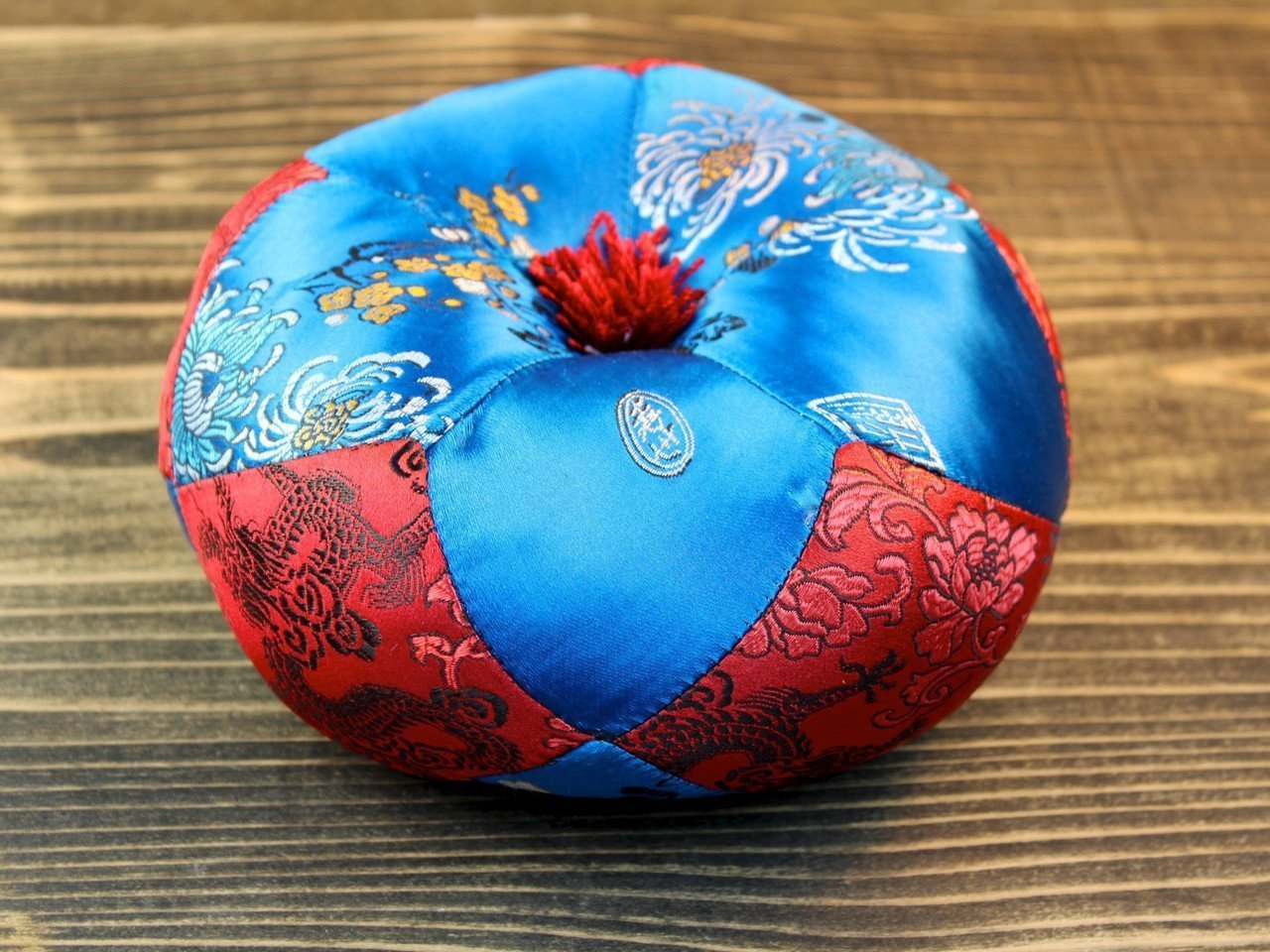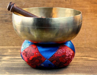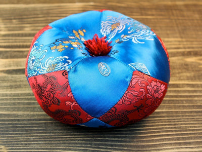 Round singing bowl pillow that has a large flower design in blue and red. Made in Nepal out of silk. Will fit any 5-8 inch singing bowl.