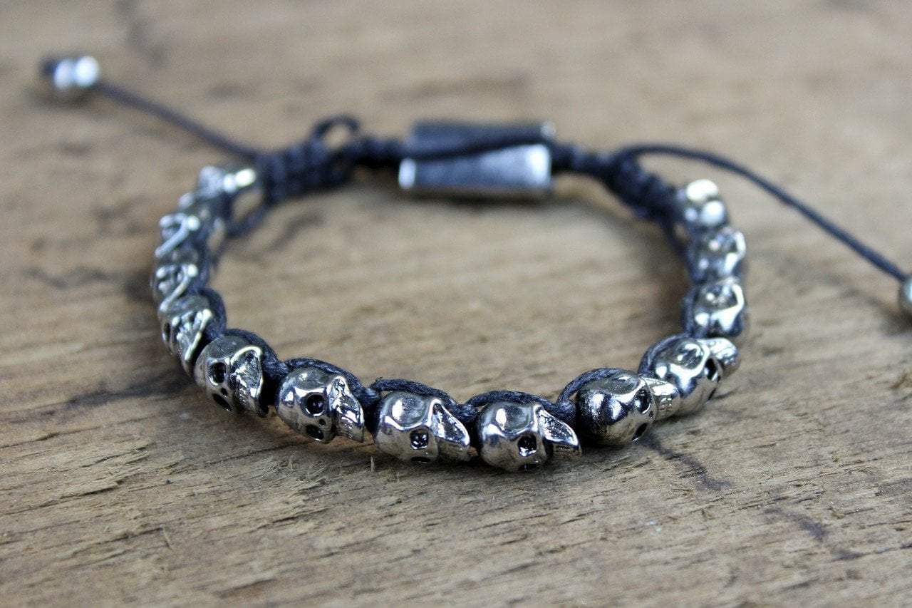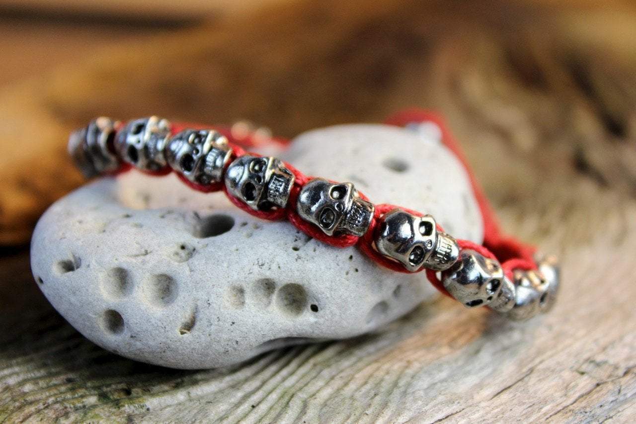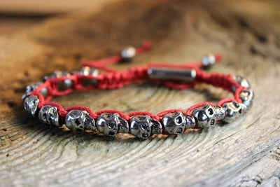 Silver skulls are hand woven onto red cord. Silver accent bead for closure. Also available in black.