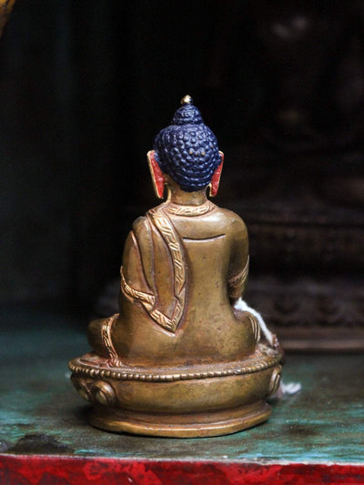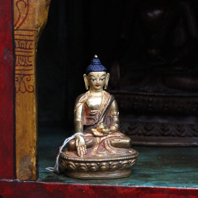 This small bronze Ratnasambhava statue is made using the lost wax method, which takes considerable time and skill. After casting, each statue is hand detailed and carved by master craftsmen. The face is hand painted with gold and will arrive covered. It is the perfect size for your altar, bookcase, or desk.