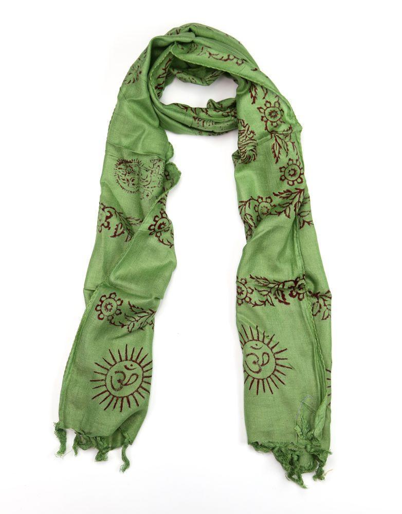 These popular Om design prayer scarves are a bit smaller and have hand tied fringe for a more finished and sophisticated look. Beautiful woodsy green color and extremely soft.