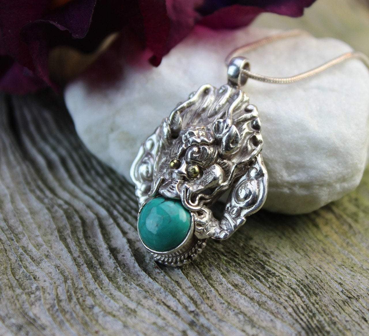 Garuda pendant with an inlaid circular turquoise stone. 100% sterling silver. A DharmaShop exclusive! Handmade in Nepal.
