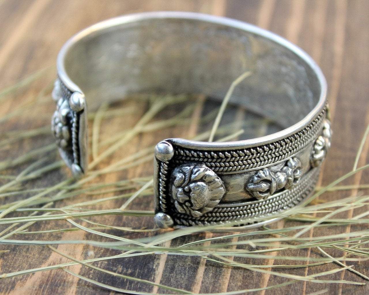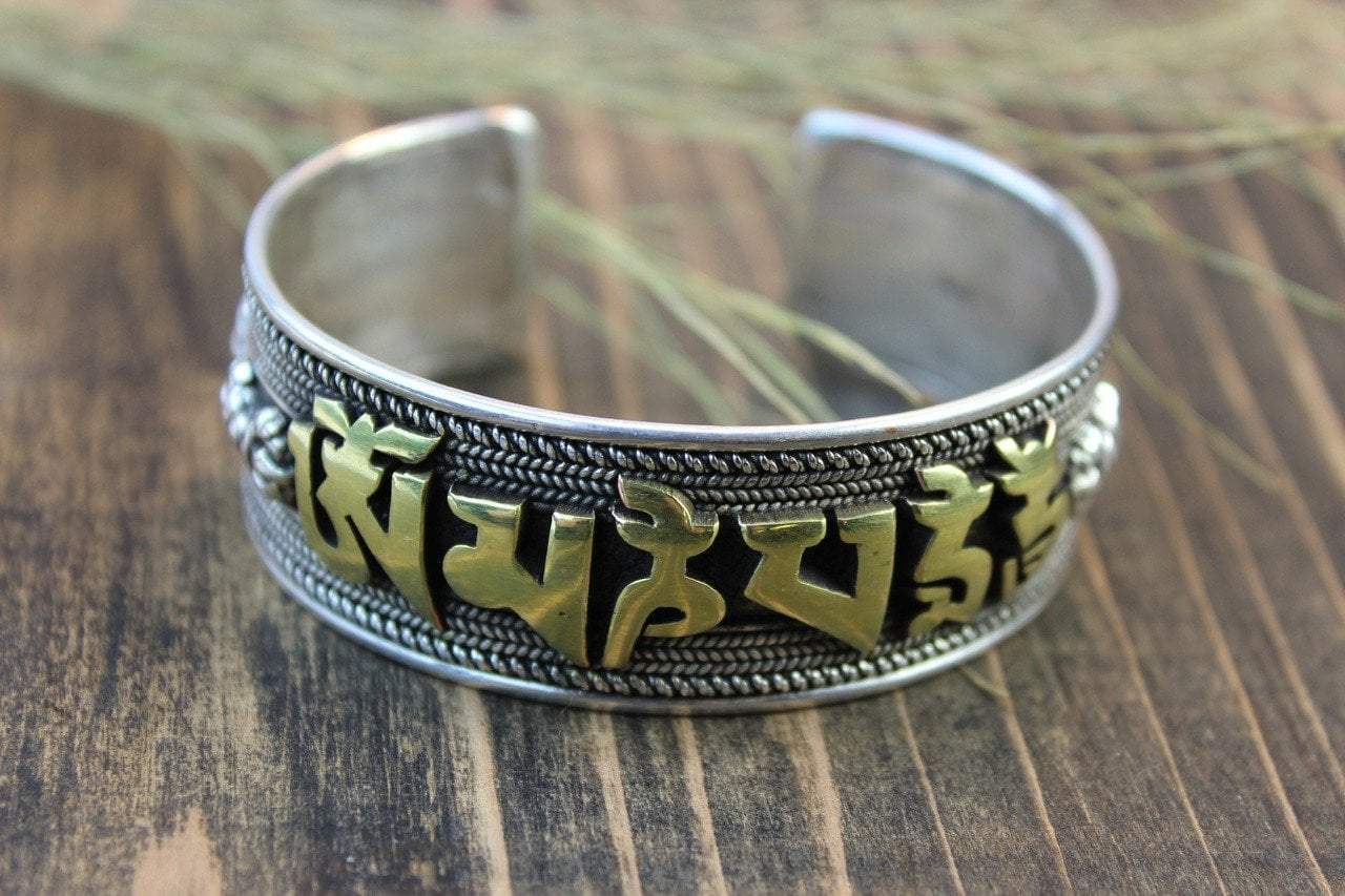 100% sterling silver cuff bracelet with compassion mantra in raised, polished brass Tibetan script. Two dorjes on either side finishing off this beautiful design. Each bracelet is hand carved with a dragon on the inside. Hand made in Kathmandu, Nepal.