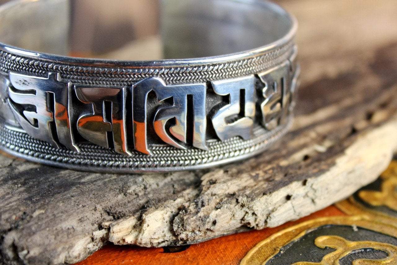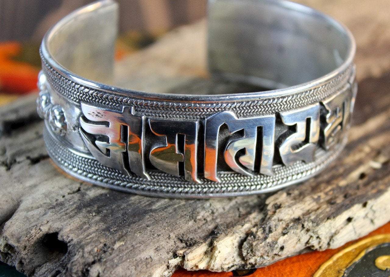 1 inch wide solid sterling (.925) silver bracelet. The outside of the cuff features the mantra, Om Mani Padme Hung, in Newar script. This mantra invokes the powerful, benevolent attention and blessings of Chenrezig, the embodiment of compassion. Bracelet also includes beautiful roping details, two dorje symbols on either side of the mantra, and two Garuda accents at the adjustable opening. An intricately detailed, hand etched dragon design decorates the inside.