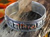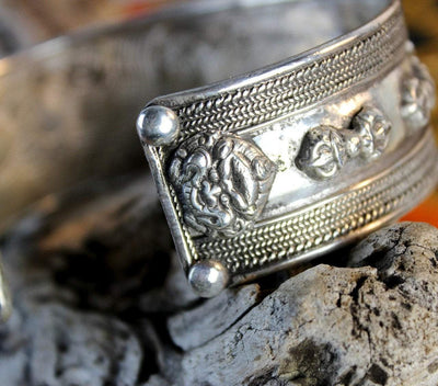 Bracelet measures approximately 1 inch wide and is quite heavy, weighing about 2 1/2 oz. Adjustable design fits almost all wrist sizes. Handmade in Kathmandu, Nepal.