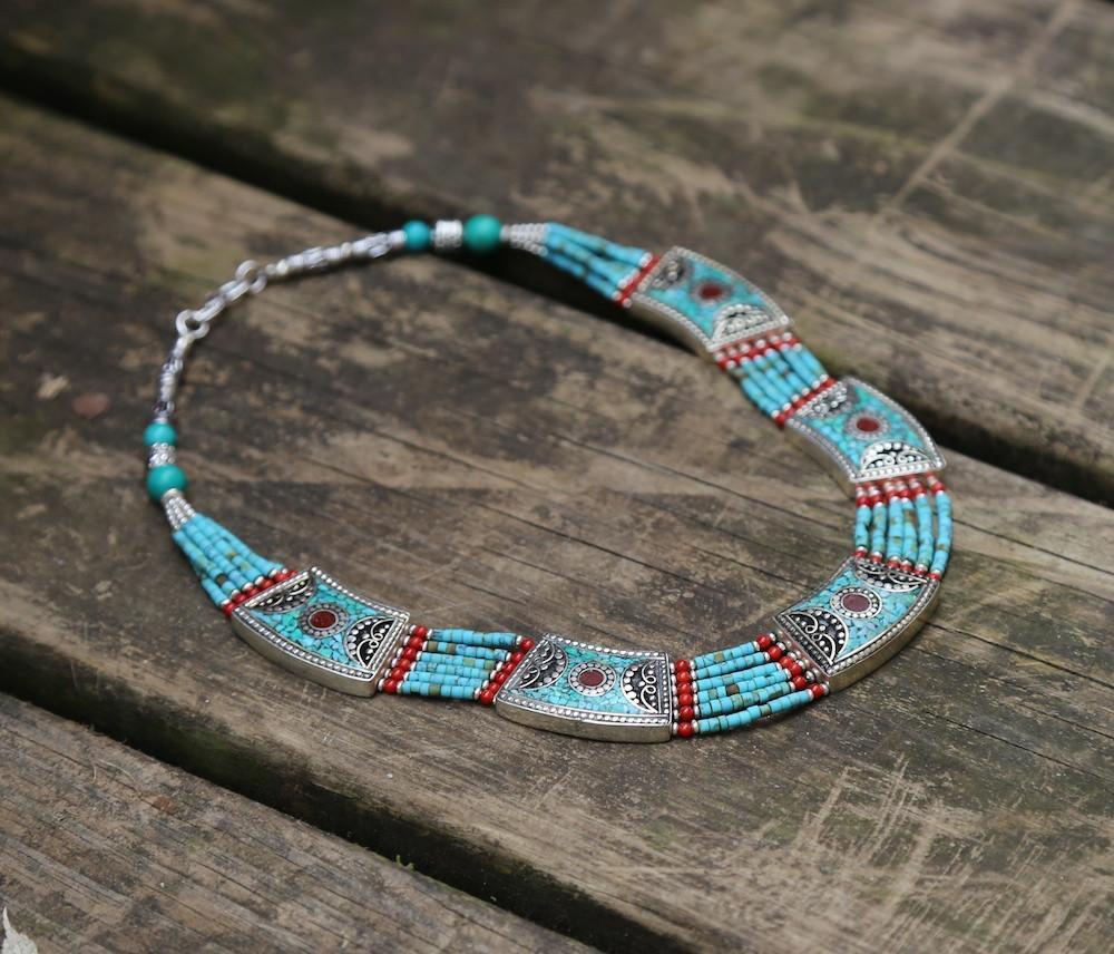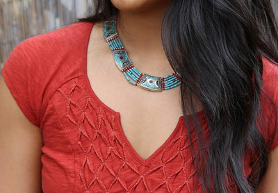 Hundreds of small turquoise and coral beads are strung together with larger silver-plated turquoise inlaid medallions on this great traditional piece.