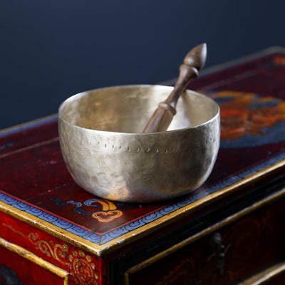 Each time we're able to get a small collection of these bowls is exciting as they are exceptional. Antique Tibetan singing bowls like this one are highly sought after for their remarkable quality sound, rich tones, and unique physical characteristics. Every handmade mark tells a story of the bowls history!