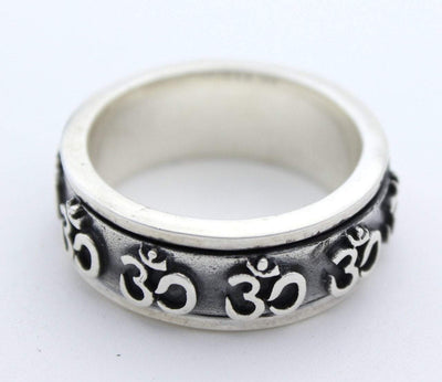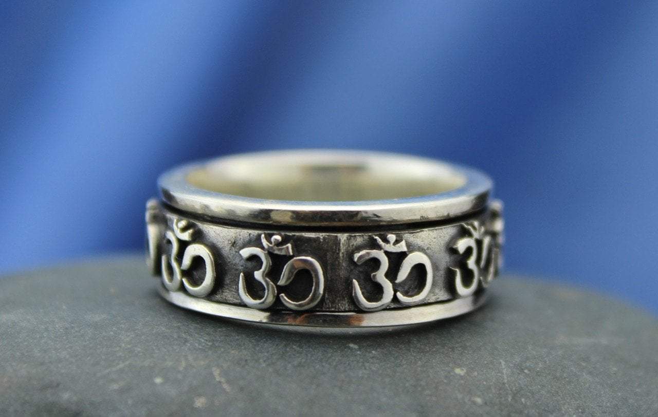 OM Sterling silver ring features a band with the Om symbol in sanskrit. Beautifully carved repeating OM pattern that spins around your finger sending good thoughts of compassion out into the world. Please choose ring size. Very limited sizes and quantities. Made in Thailand.