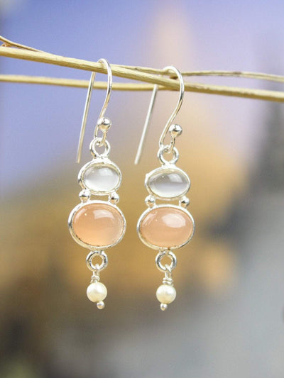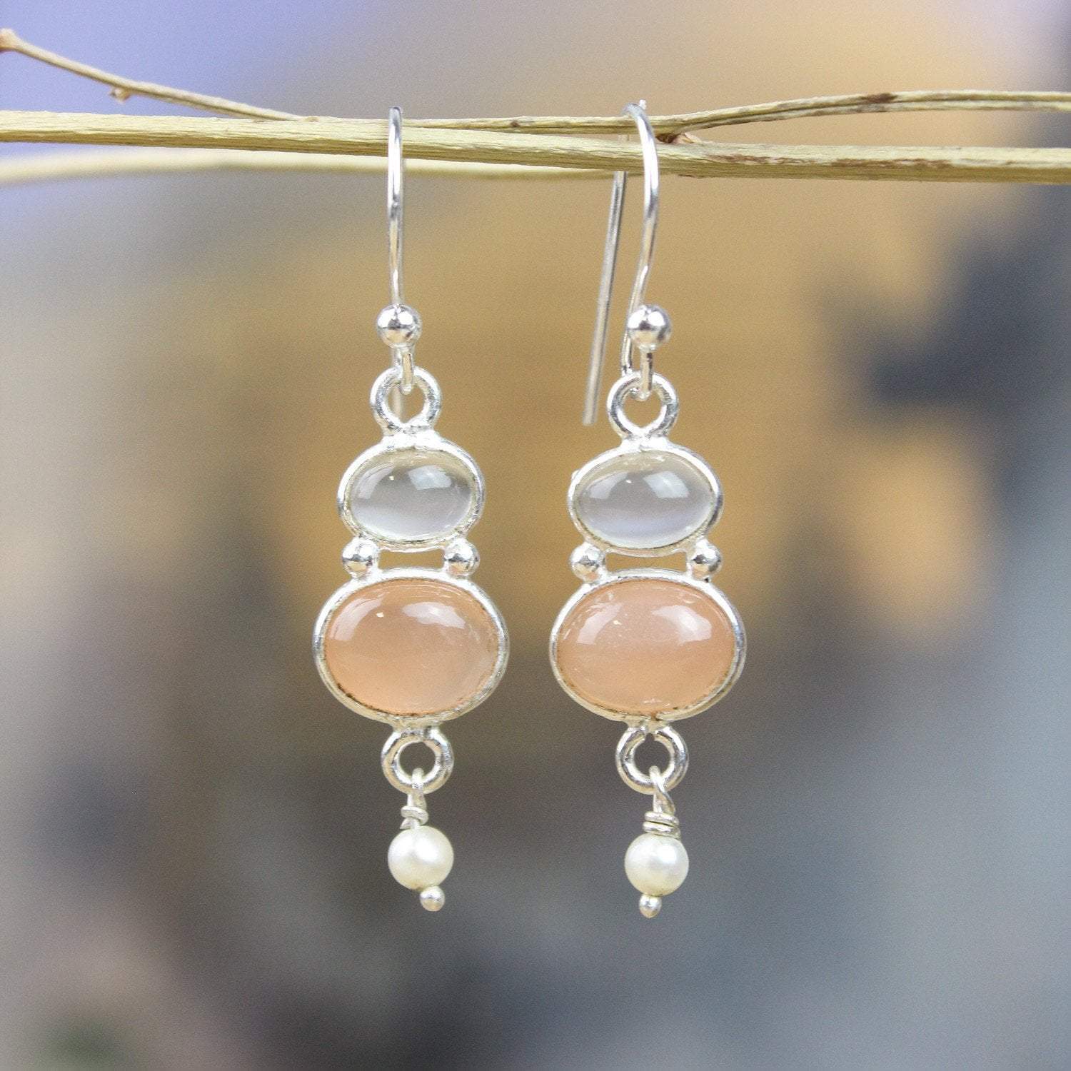 These gorgeous and dainty drop earrings are handcrafted by skilled artisans in India. They feature moonstone and peach moonstone gemstones with pearl accents on sterling silver.