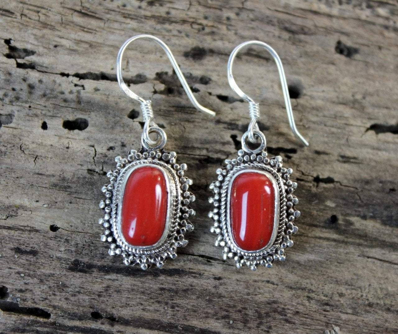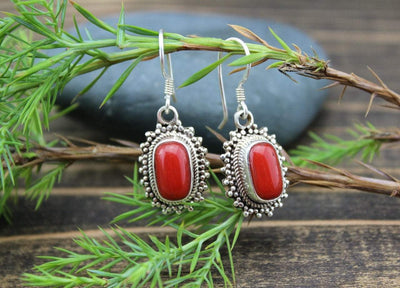 These earrings contain true red coral, the stone of passion, and are beautifully set in sterling silver, which give off a flower-like look.