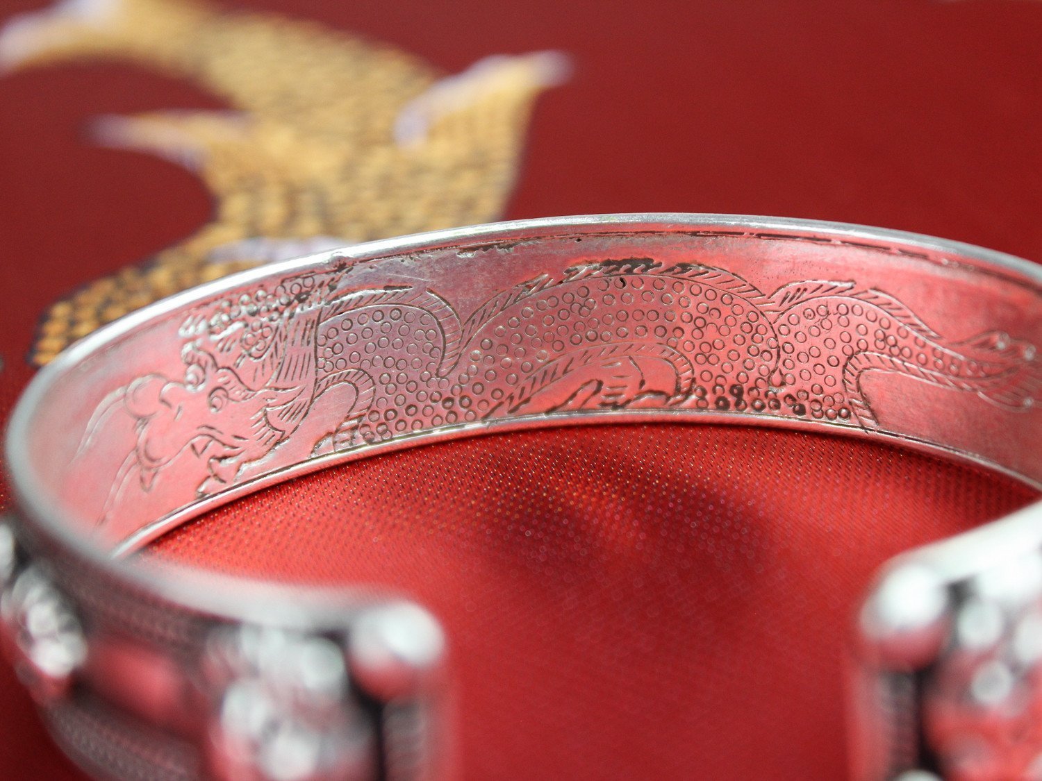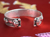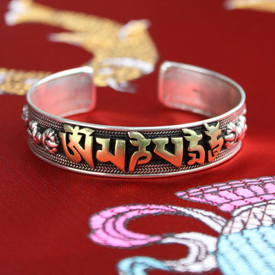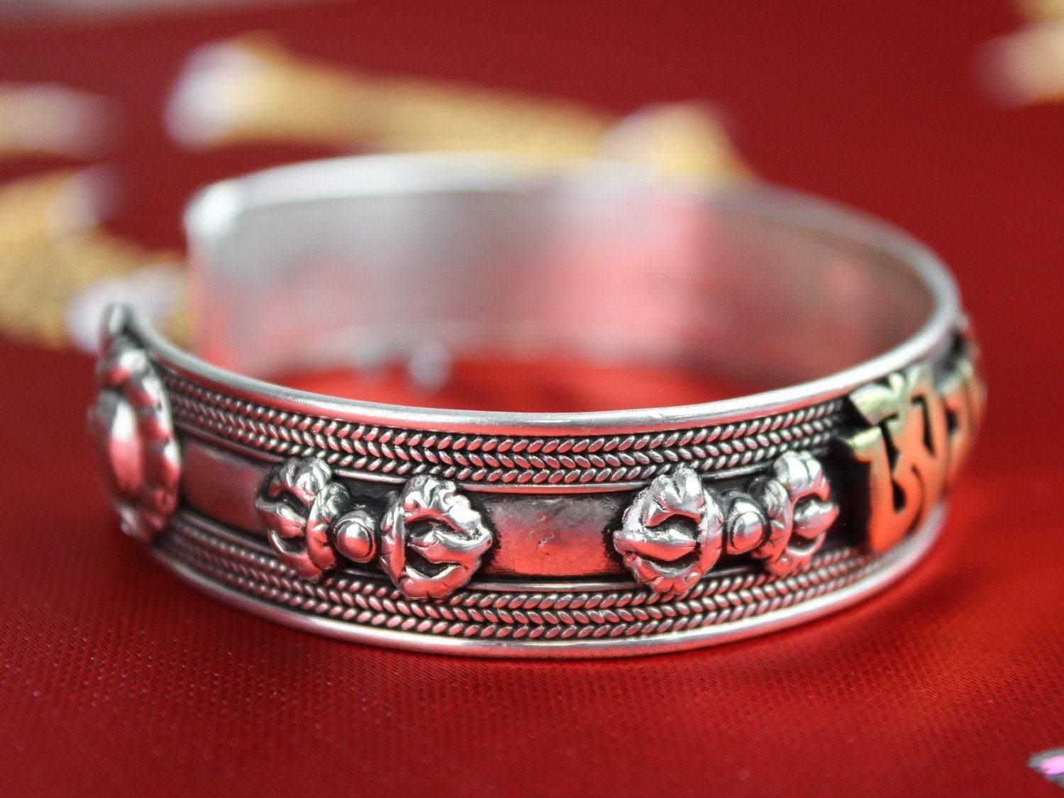 This fully adjustable solid .925 sterling silver bracelet with gold vermeil is made in Nepal and features the mantra of compassion, 'Om Mani Padme Hum' in Tibetan script. The mantra invokes the powerful benevolent attention and blessings of Chenrezig, the embodiment of compassion. This bracelet also includes beautiful roping details, two dorje symbols on either side of the mantra, two Garuda accents at the adjustable opening, and a carved dragon design inside the cuff.