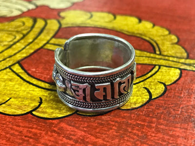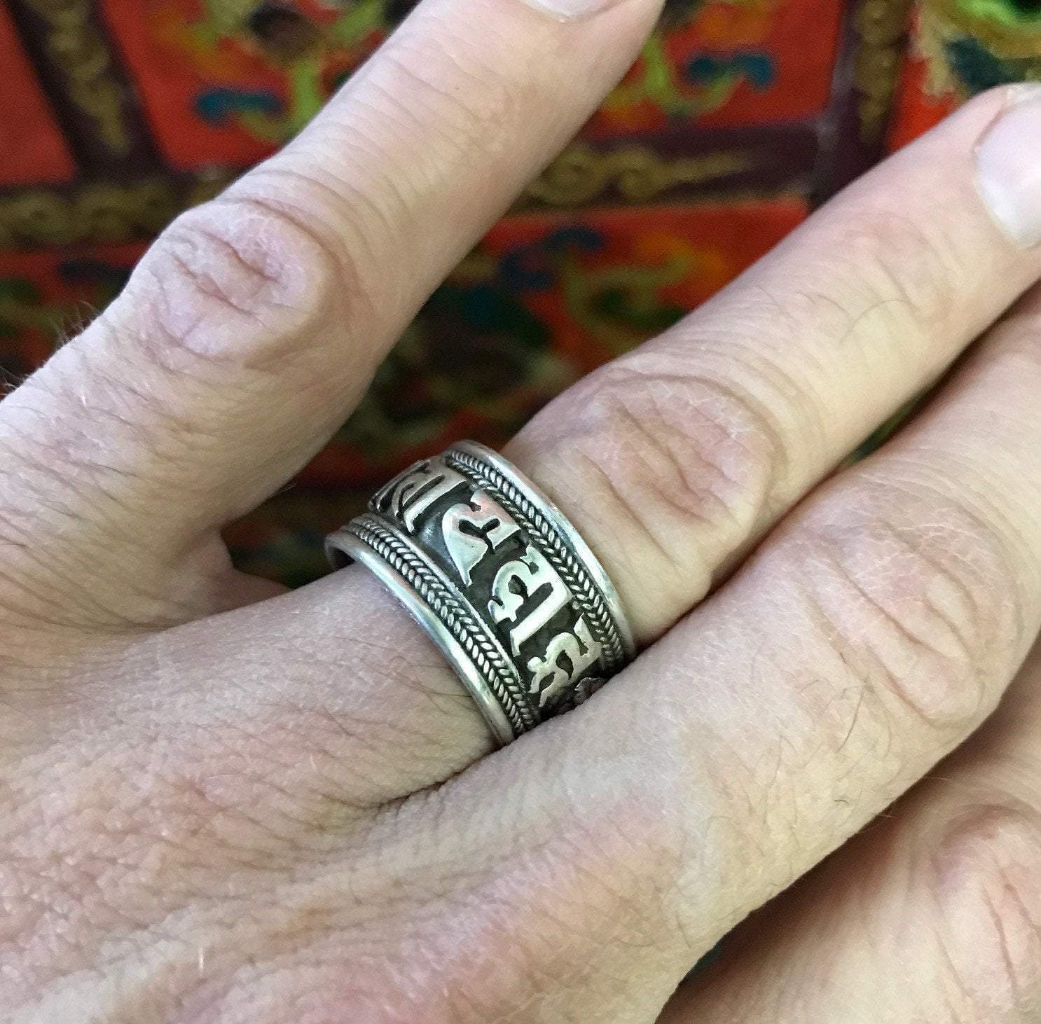 Solid sterling Sanskrit silver ring with the mantra of compassion 'Om Mani Padme Hum' in Tibetan script carved into the ring with two dorjes on either side of the mantra. Limited quantity. Hand made in Nepal.
