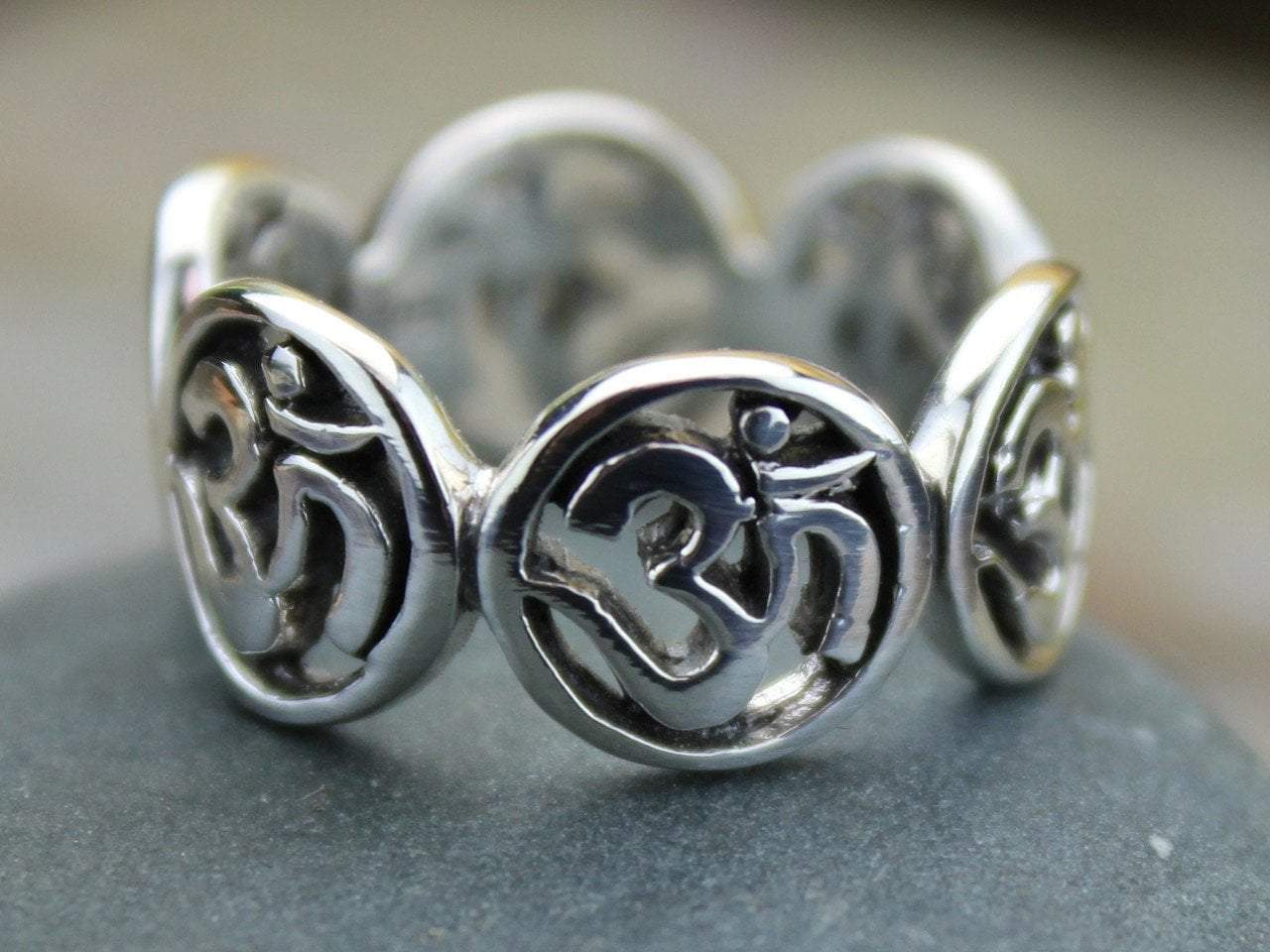 Sterling silver. Hand made with the OM symbol repeated all around the ring. Limited quantities.