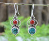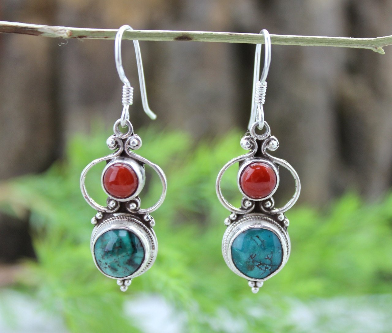 Sterling silver and coral and turquoise circle earrings. 29 mm tall.