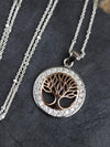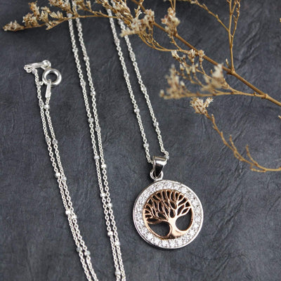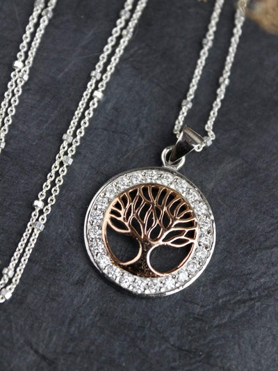 This exquisite necklace features a beautiful sterling silver pendant with a pink gold vermeil Tree of Life design surrounded by cubic zirconia stones. It's the perfect gift for yourself or someone special!