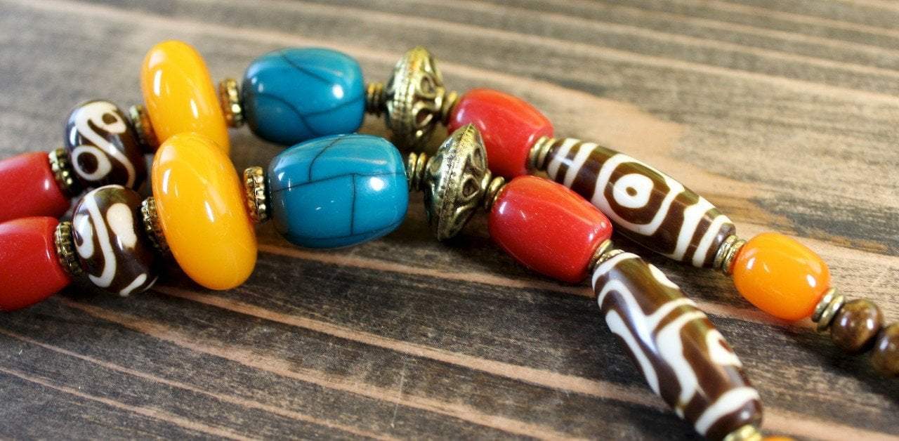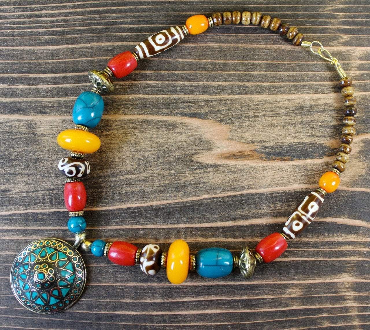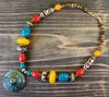A traditional necklace created by Qazi in Kathmandu, Nepal with all the beautiful colors of a mountain sun. Makes the perfect compliment to any smile!