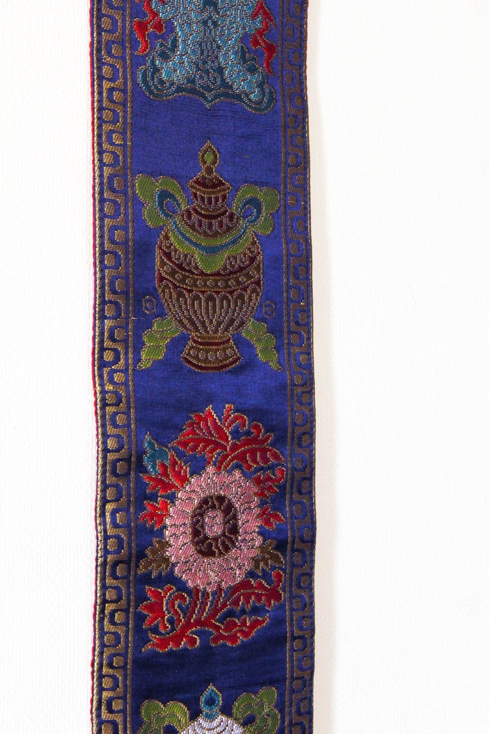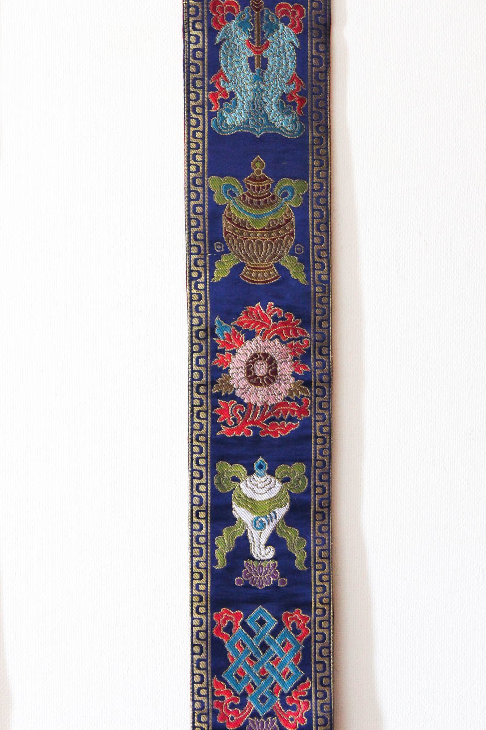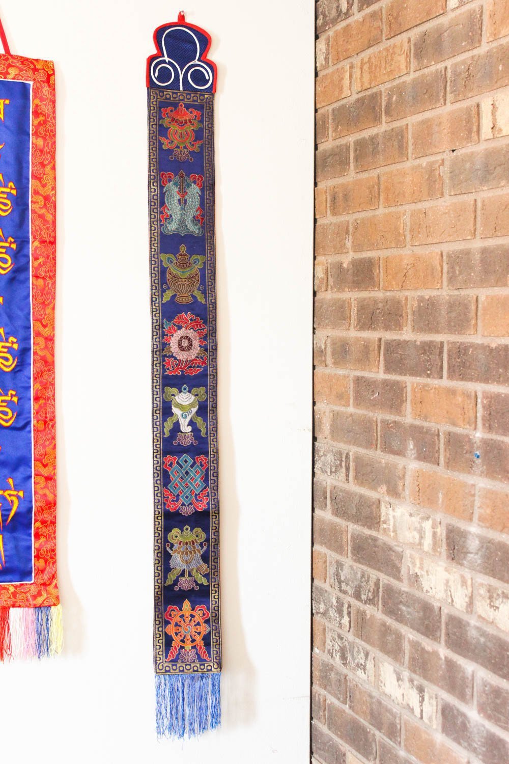Bold and beautiful vertical Astamangal Tibetan brocade banner. Perfect for a spiritual or sacred space.