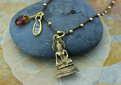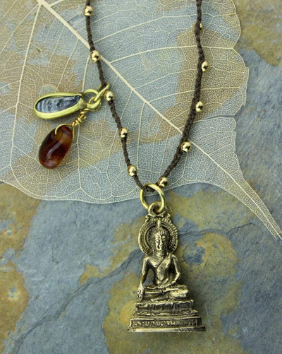 Brass Thai Buddha Pendant hangs in the center with an offset small clay Buddha charm and a glass bead charm. All on a woven satellite chain.