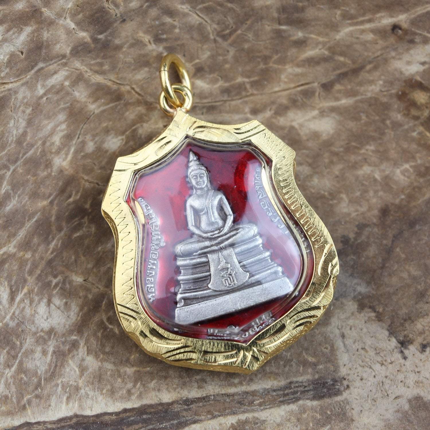 Dhyana "Meditating" Buddha Amulet accented in brilliant red from Thailand. Wrapped in gold-plated brass with a plastic cover for protection.