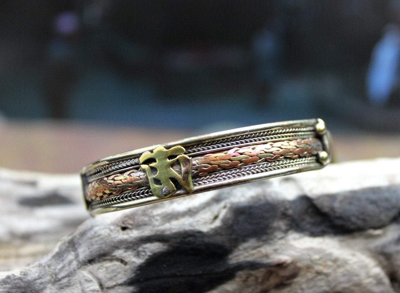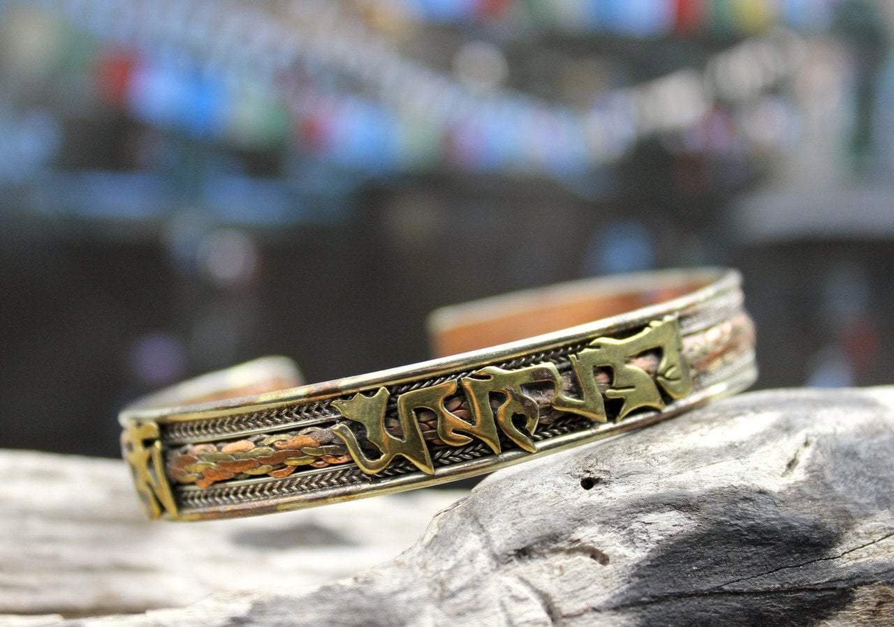 Fully adjustable, hand carved, mantra bracelet is made of brass, copper and silver.