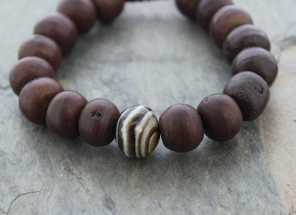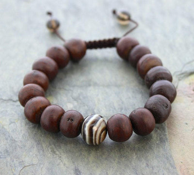 Adjustable wrist mala can fit wrists from 6 to 8 inches around.  Includes 13mm bodhi seed beads, a 14mm Tibetan agate bead, and two 6mm onyx toggle beads.  Handmade here in the DharmaShop!