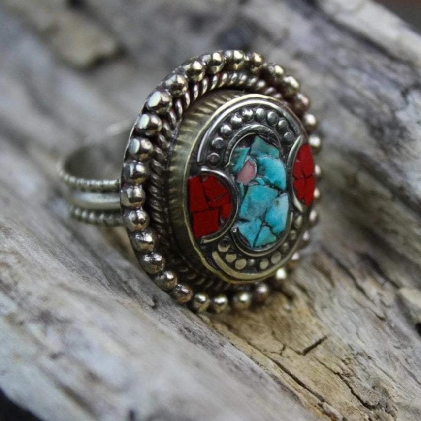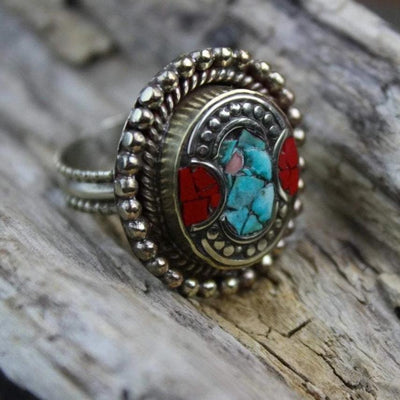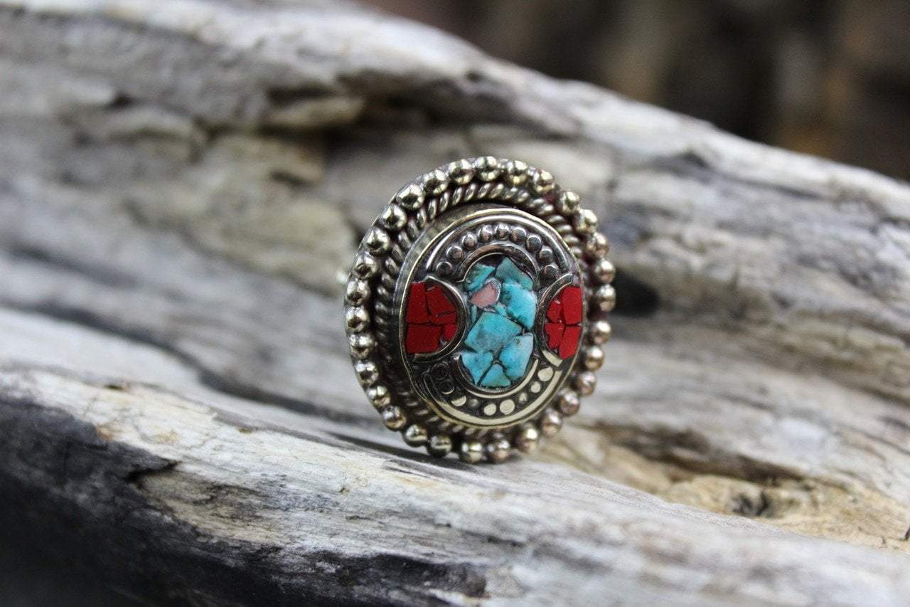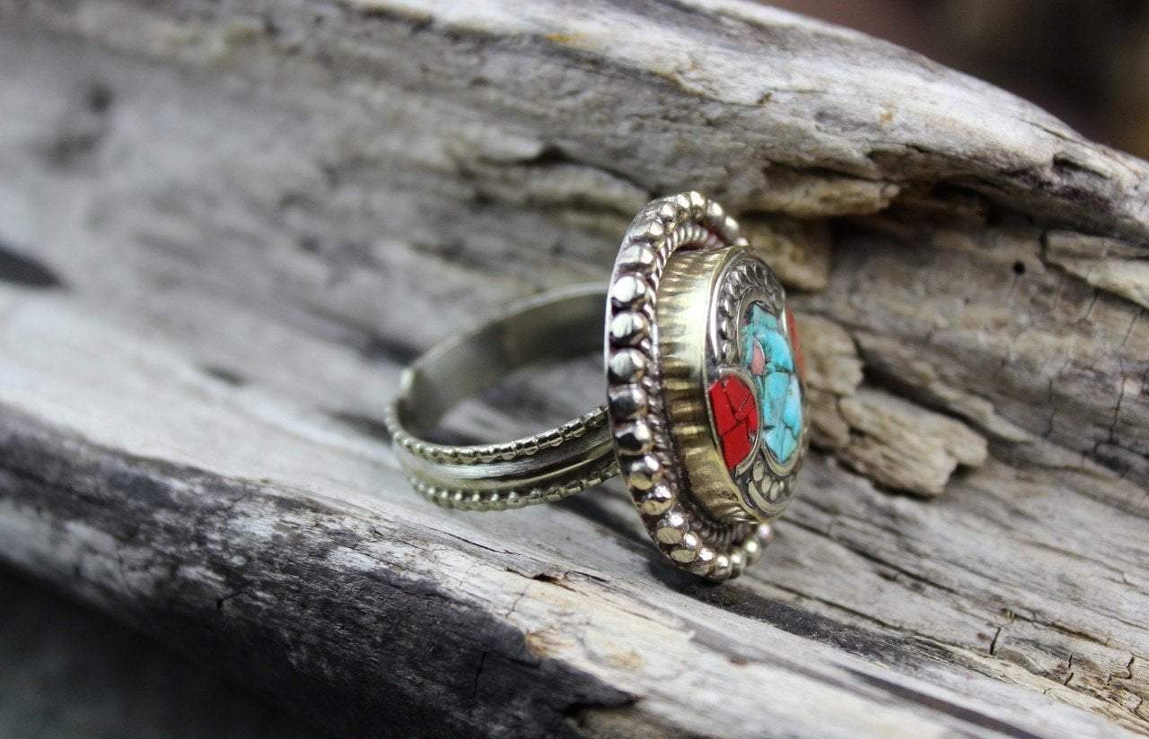 Handcrafted white metal, Tibetan style, ring with inlaid coral and turquoise stones.