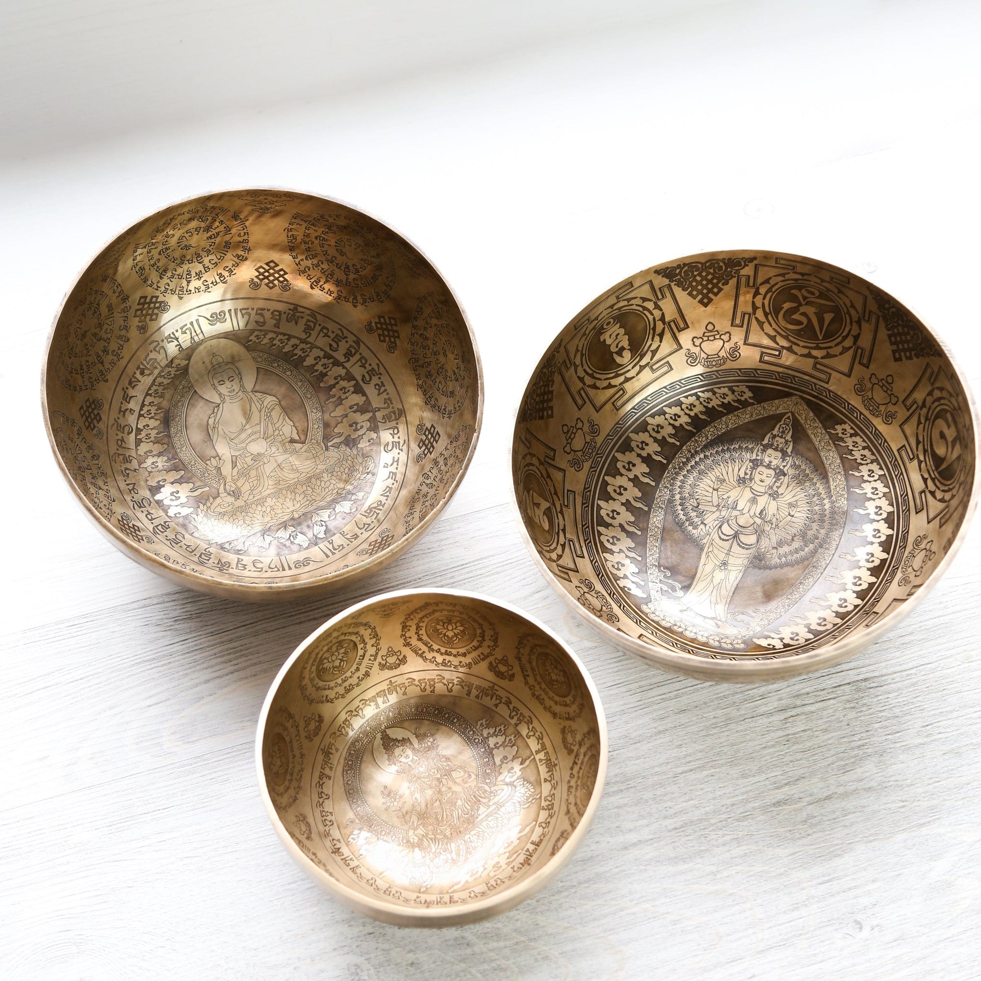 • This curated collection includes our Medicine Buddha, Avalokiteshvara Bodhisattva, and Green Tara singing bowls to create a deity set for healing and harmony.