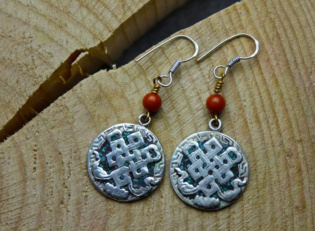 Make a statement with these amazing and bold Tibetan earrings! Hand crafted eternal knot earrings plated in silver with coral bead above. Handmade in Nepal.