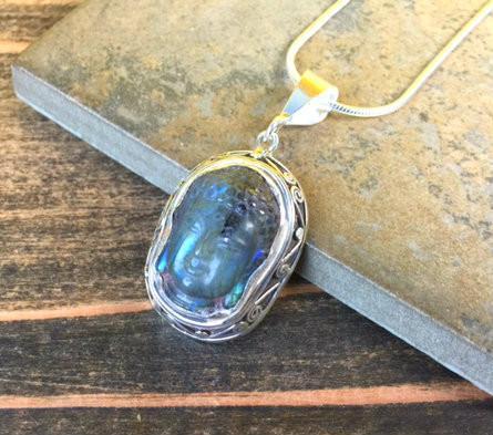 Elegant cast Buddha head with serene meditative expression is set in sterling silver with sterling bail. Intricate hand rope-work decorates the sides of setting. Handmade in Nepal.